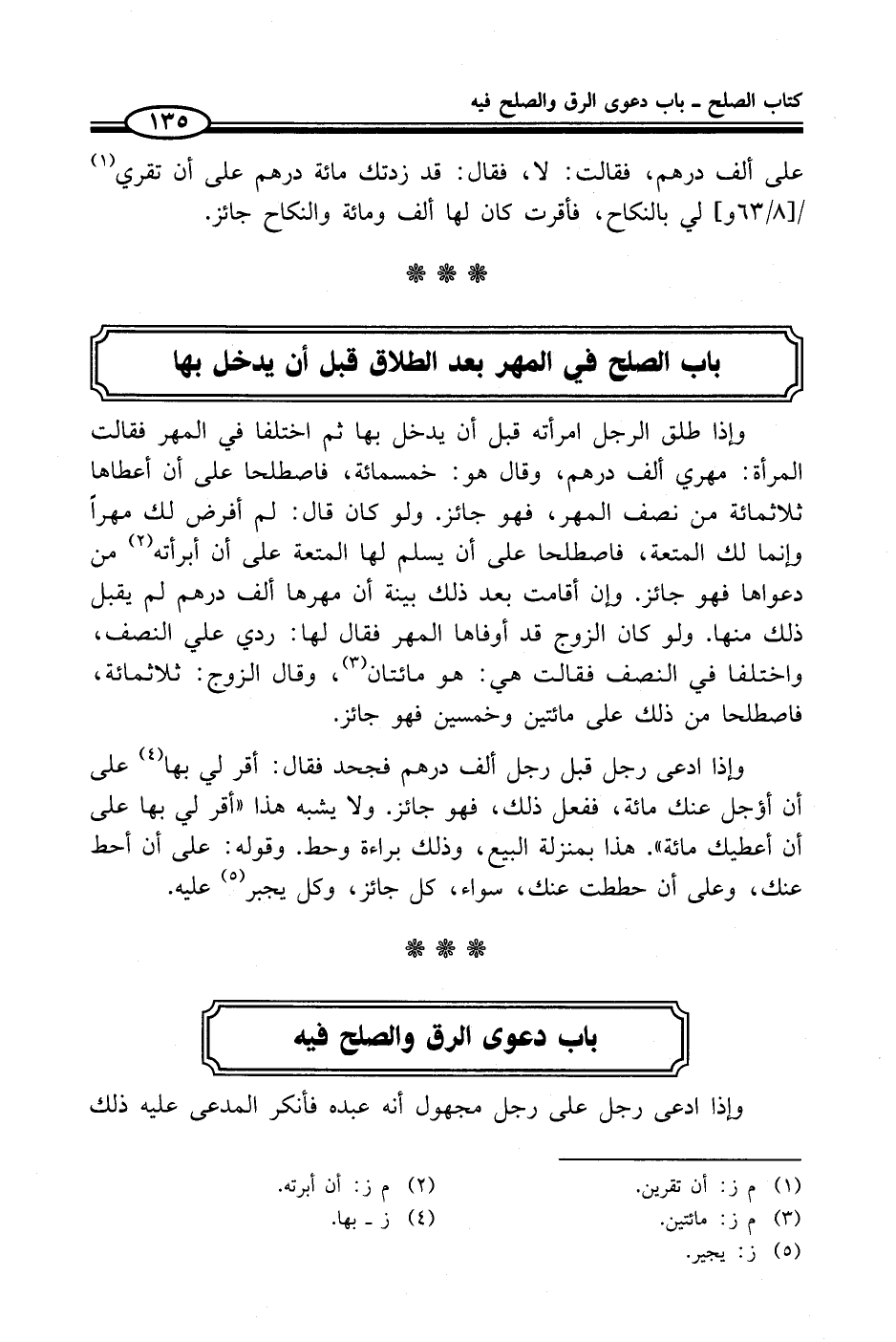 وإذا طلق الرجل امرأته قبل أن يدخل بها ثم اختلفا في المهر فقالت المرأة: مهري ألف درهم، وقال هو: خمسمائة، فاصطلحا على أن أعطاها ثلاثمائة من نصف المهر، فهو جائز. ولو كان قال: لم أفرض لك مهراً وإنما لك المتعة، فاصطلحا على أن يسلم لها المتعة على أن أبرأته (¬2) من دعواها فهو جائز. وإن أقامت بعد ذلك بينة أن مهرها ألف درهم لم يقبل ذلك منها. ولو كان الزوج قد أوفاها المهر فقال لها: ردي علي النصف، واختلفا في النصف فقالت هي: هو مائتان (¬3)، وقال الزوج: ثلاثمائة، فاصطلحا من ذلك على مائتين وخمسين فهو جائز.