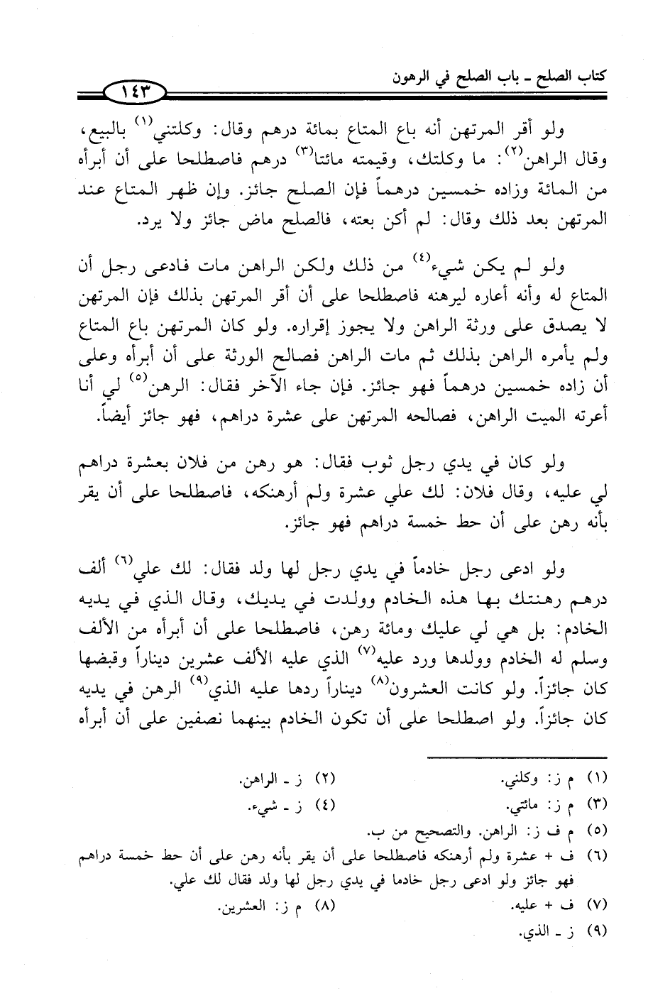 (¬6) ف + عشرة ولم أرهنكه فاصطلحا على أن يقر بأنه رهن على أن حط خمسة دراهم فهو جائز ولو ادعى رجل خادما في يدي رجل لها ولد فقال لك علي.