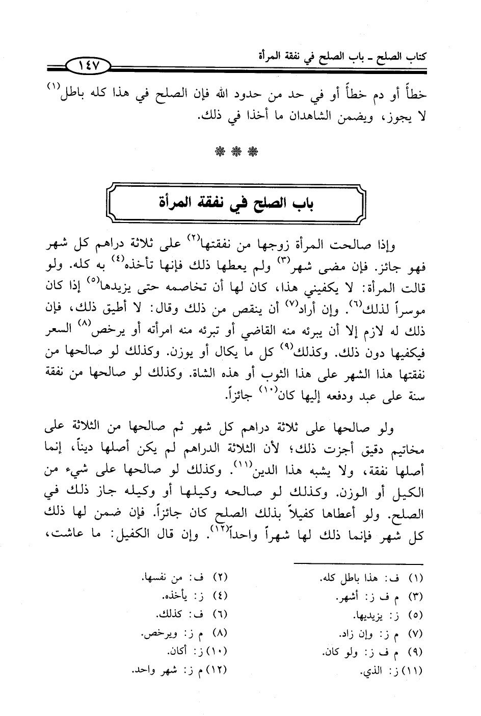 وإذا صالحت المرأة زوجها من نفقتها (¬2) على ثلاثة دراهم كل شهر فهو جائز. فإن مضى شهر (¬3) ولم يعطها ذلك فإنها تأخذه (¬4) به كله. ولو قالت المرأة: لا يكفيني هذا، وإن لها أن تخاصمه حتى يزيدها (¬5) إذا كان موسراً لذلك (¬6). وإن أراد (¬7) أن ينقص من ذلك وقال: لا أطيق ذلك، فإن ذلك له لازم إلا أن يبرئه منه القاضي أو تبرئه منه امرأته أو يرخص (¬8) السعر فيكفيها دون ذلك. وكذلك (¬9) كل ما يكال أو يوزن. وكذلك لو صالحها من نفقتها هذا الشهر على هذا الثوب أو هذه الشاة. وكذلك لو صالحها من نفقة سنة على عبد ودفعه إليها كان (¬10) جائزاً.