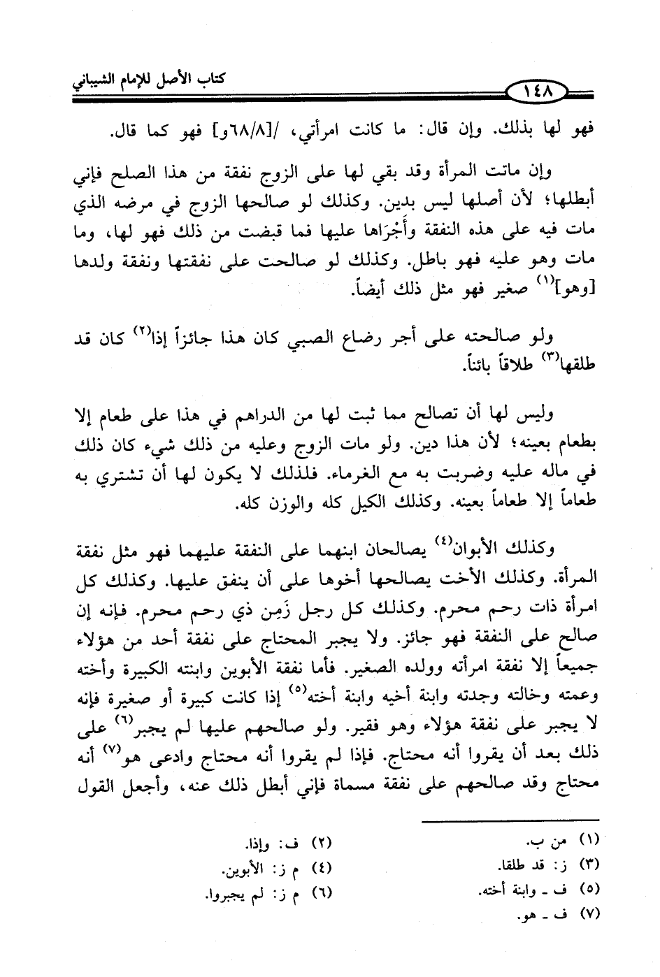 وكذلك الأبوان (¬4) يصالحان ابنهما على النفقة عليهما فهو مثل نفقة المرأة. وكذلك الأخت يصالحها أخوها على أن ينفق عليها. وكذلك كل امرأة ذات رحم محرم. وكذلك كل رجل زَمِن ذي رحم محرم. فإنه إن صالح على النفقة فهو جائز. ولا يجبر المحتاج على نفقة أحد من هؤلاء جميعاً إلا نفقة امرأته وولده الصغير، فأما نفقة الأبوين وابنته الكبيرة وأخته وعمته وخالته وجدته وابنة أخيه وابنة أخته (¬5) إذا كانت كبيرة أو صغيرة فإنه لايجبر على نفقة هؤلاء وهو فقير. ولو صالحهم عليها لم يجبر (¬6) على ذلك بعد أن يقروا أنه محتاج. فإذا لم يقروا أنه محتاج وادعى هو (¬7) أنه محتاج وقد صالحهم على نفقة مسماة فإني أبطل ذلك عنه، وأجعل القول