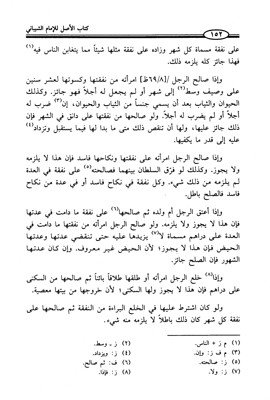وإذا صالح الرجل امرأته من نفقتها وكسوتها لعشر سنين على وصيف وسط (¬2) إلى شهر أو لم يجعل له أجلاً فهو جائز. وكذلك الحيوان والثياب بعد أن يسمي جنساً من الثياب والحيوان، إن (¬3) ضرب له أجلاً أو لم يضرب له أجلاً. ولو صالحها من نفقتها على دانق في الشهر فإن ذلك جائز عليها، ولها أن تنقص ذلك متى ما بدا لها فيما يستقبل وتزداد (¬4) عليه إلى قدر ما يكفيها.