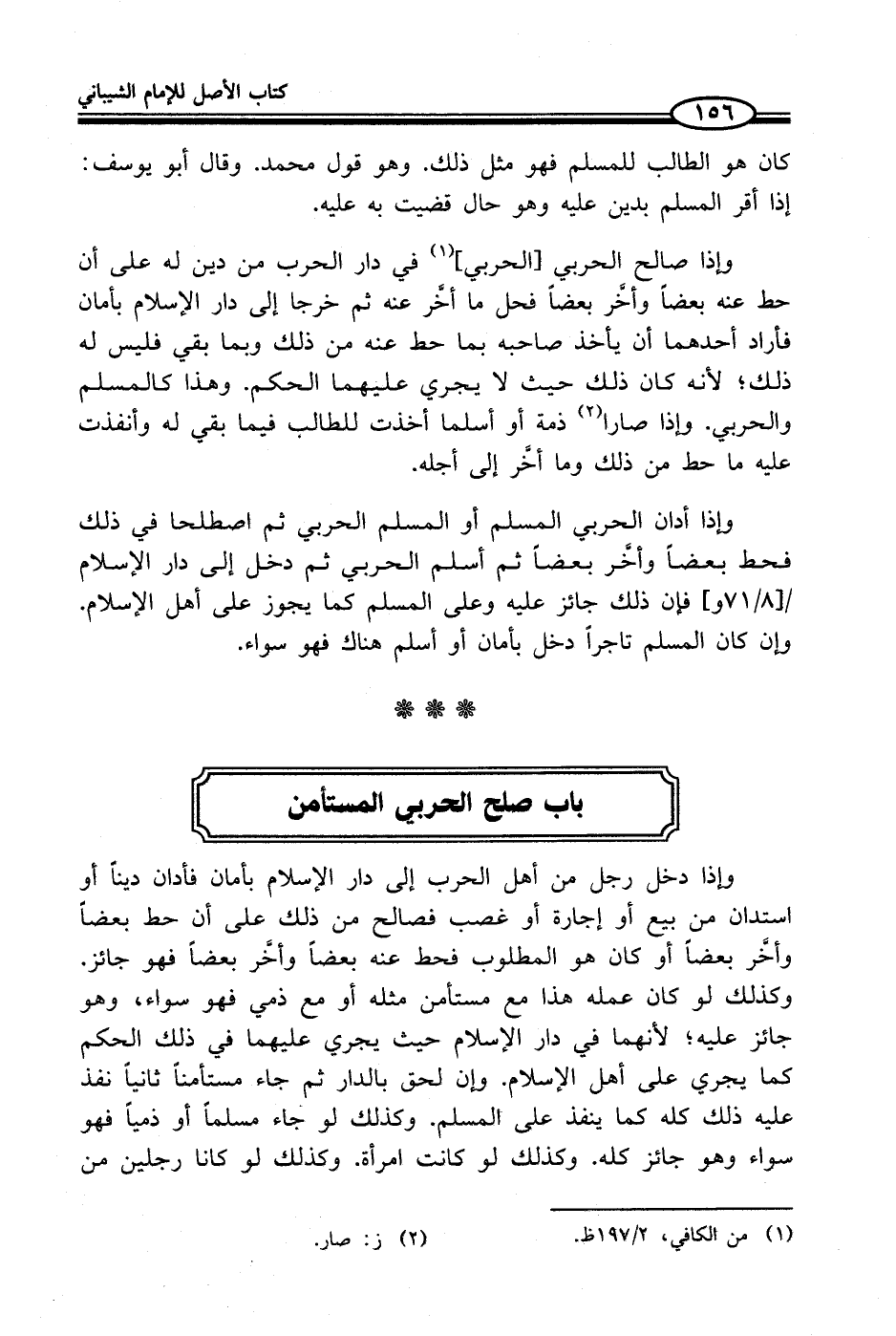 وإذا دخل رجل من أهل الحرب إلى دار الإسلام بأمان فأدان ديناً أو استدان من بيع أو إجارة أو غصب فصالح من ذلك محلى أن حط بعضاً وأخَّر بعضاً أو كان هو المطلوب فحط عنه بعضاً وأخَّر بعضاً فهو جائز. وكذلك لو كان عمله هذا مع مستأمن مثله أو مع ذمي فهو سواء، وهو جائز عليه؛ لأنهما في دار الإسلام حيث يجري عليهما في ذلك الحكم كما يجري على أهل الإسلام. وإن لحق بالدار ثم جاء مستأمناً ثانياً نفذ عليه ذلك كله كما ينفذ على المسلم. وكذلك لو جاء مسلماً أو ذمياً فهو سواء وهو جائز كله. وكذلك لو كانت امرأة. وكذلك لو كانا رجلين من