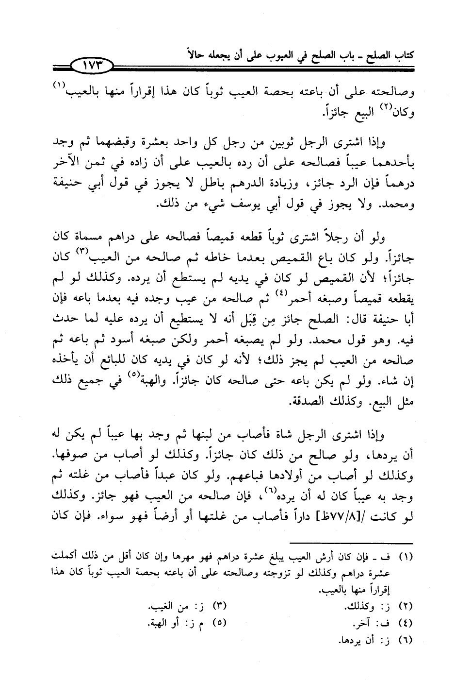 ولو أن رجلاً اشترى ثوباً قطعه قميصاً فصالحه على دراهم مسماة كان جائزاً. ولو كان باع القميص بعدما خاطه ثم صالحه من العيب (¬3) كان جائزاً؛ لأن القميص لو كان في يديه لم يستطع أن يرده. وكذلك لو لم يقطعه قميصاً وصبغه أحمر (¬4) ثم صالحه من عيب وجده فيه بعدما باعه فإن أبا حنيفة قال: الصلح جائز مِن قِبَل أنه لا يستطيع أن يرده عليه لما حدث فيه. وهو قول محمد. ولو لم يصبغه أحمر ولكن صبغه أسود ثم باعه ثم صالحه من العيب لم يجز ذلك؛ لأنه لو كان في يديه كان للبائع أن يأخذه إن شاء. ولو لم يكن باعه حتى صالحه كان جائزاً. والهبة (¬5) في جميع ذلك مثل البيع. وكذلك الصدقة.