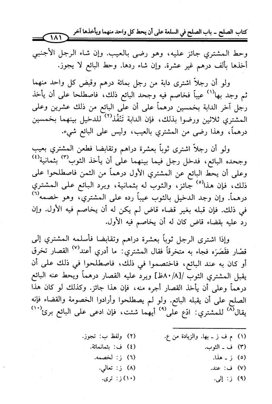 وإذا اشترى الرجل ثوباً بعشرة دراهم وتقابضا فأسلمه المشتري إلى قصّار فقَصَرَه فجاء به متخرقاً فقال المشتري: ما أدري أعند (¬7) القصار تخرق أو كان به عند البائع، فاختصموا في ذلك، فاصطلحوا في ذلك على أن يقبل المشتري الثوب ويرد عليه القصار درهماً ويحط عنه البائع درهماً وعلى أن يأخذ القصار أجره منه، فإن هذا جائز. وكذلك لو كان هذا الصلح على أن يقبله البائع. ولو لم يصطلحوا وأرادوا الخصومة والقضاء فإنه يقال (¬8) للمشتري: ادّع على (¬9) أيهما شئت، فإن ادعى على البائع برئ (¬10)