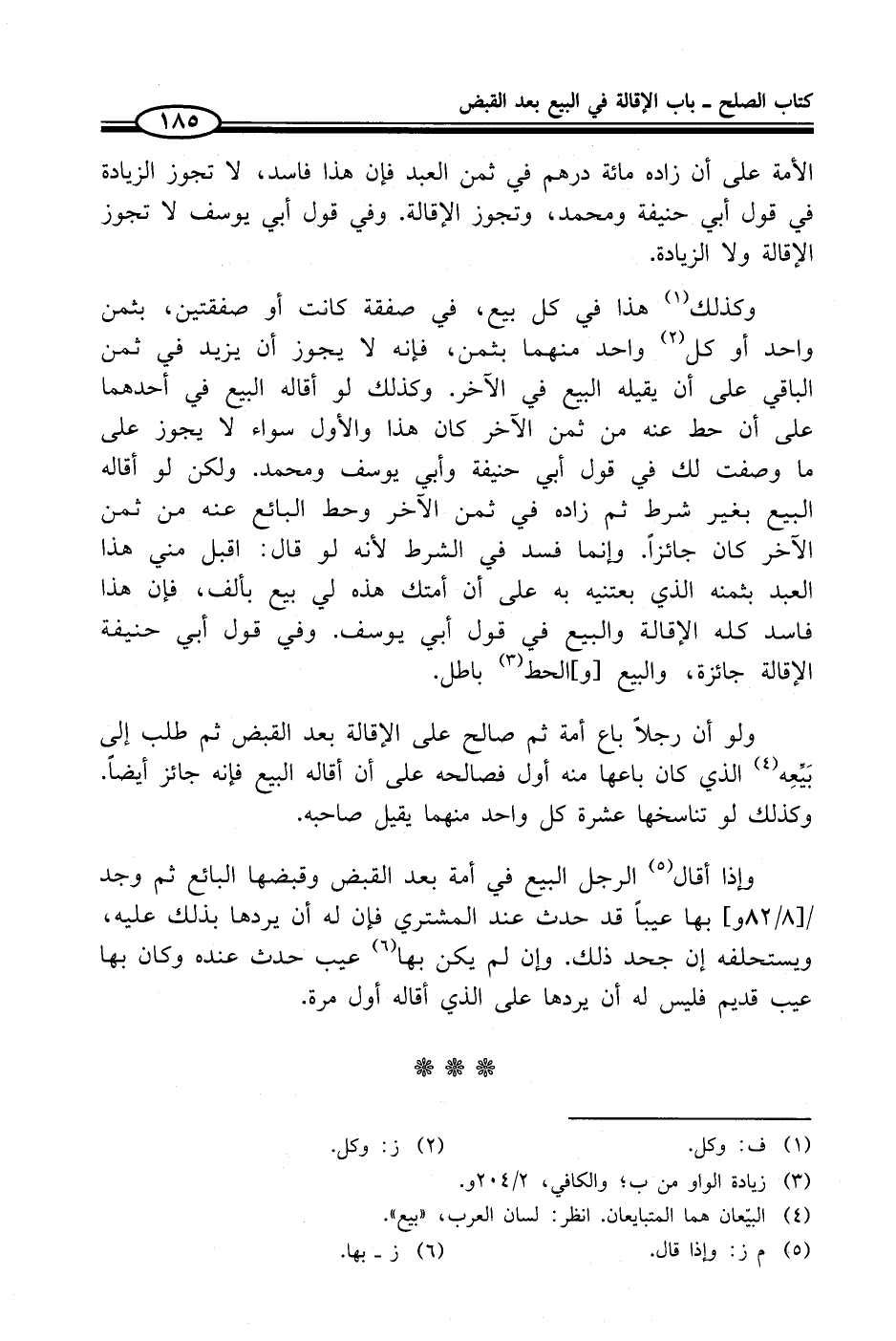 ولو أن رجلاً باع أمة ثم صالح على الإقالة بعد القبض ثم طلب إلى بَيِّعِه (¬4) الذي كان باعها منه أول فصالحه على أن أقاله البيع فإنه جائز أيضاً. وكذلك لو تناسخها عشرة كل واحد منهما يقيل صاحبه.