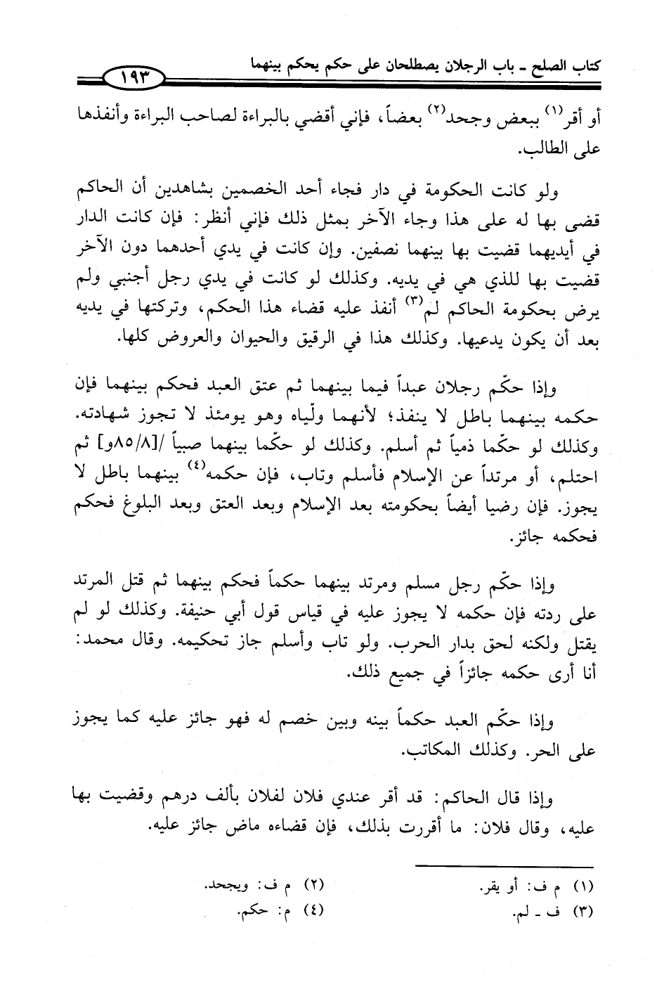 وإذا حكّم رجلان عبداً فيما بينهما ثم عتق العبد فحكم بينهما فإن حكمه بينهما باطل لا ينفذ؛ لأنهما ولّياه وهو يومئذ لا تجوز شهادته. وكذلك لو حكّما ذمياً ثم أسلم. وكذلك لو حكّما بينهما صبياً ثم احتلم، أو مرتداً عن الإسلام فأسلم وتاب، فإن حكمه (¬4) بينهما باطل لا يجوز. فإن رضيا أيضاً بحكومته بعد الإسلام وبعد العتق وبعد البلوغ فحكم فحكمه جائز.