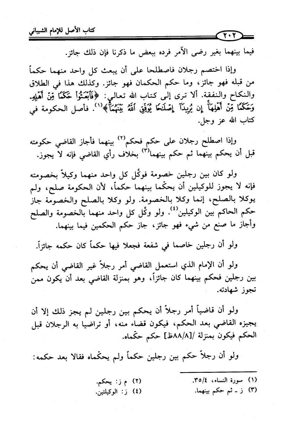 وإذا اختصم رجلان فاصطلحا على أن يبعث كل واحد منهما حكماً من قبله فهو جائز، وما حكم الحكمان فهو جائز. وكذلك هذا في الطلاق والنكاح والنفقة. ألا ترى إلى كتاب الله تعالى: {فَابْعَثُوا حَكَمًا مِنْ أَهْلِهِ وَحَكَمًا مِنْ أَهْلِهَا إِنْ يُرِيدَا إِصْلَاحًا يُوَفِّقِ اللَّهُ بَيْنَهُمَا} (¬1). فأصل الحكومة في كتاب الله -عَزَّ وَجَلَّ-.