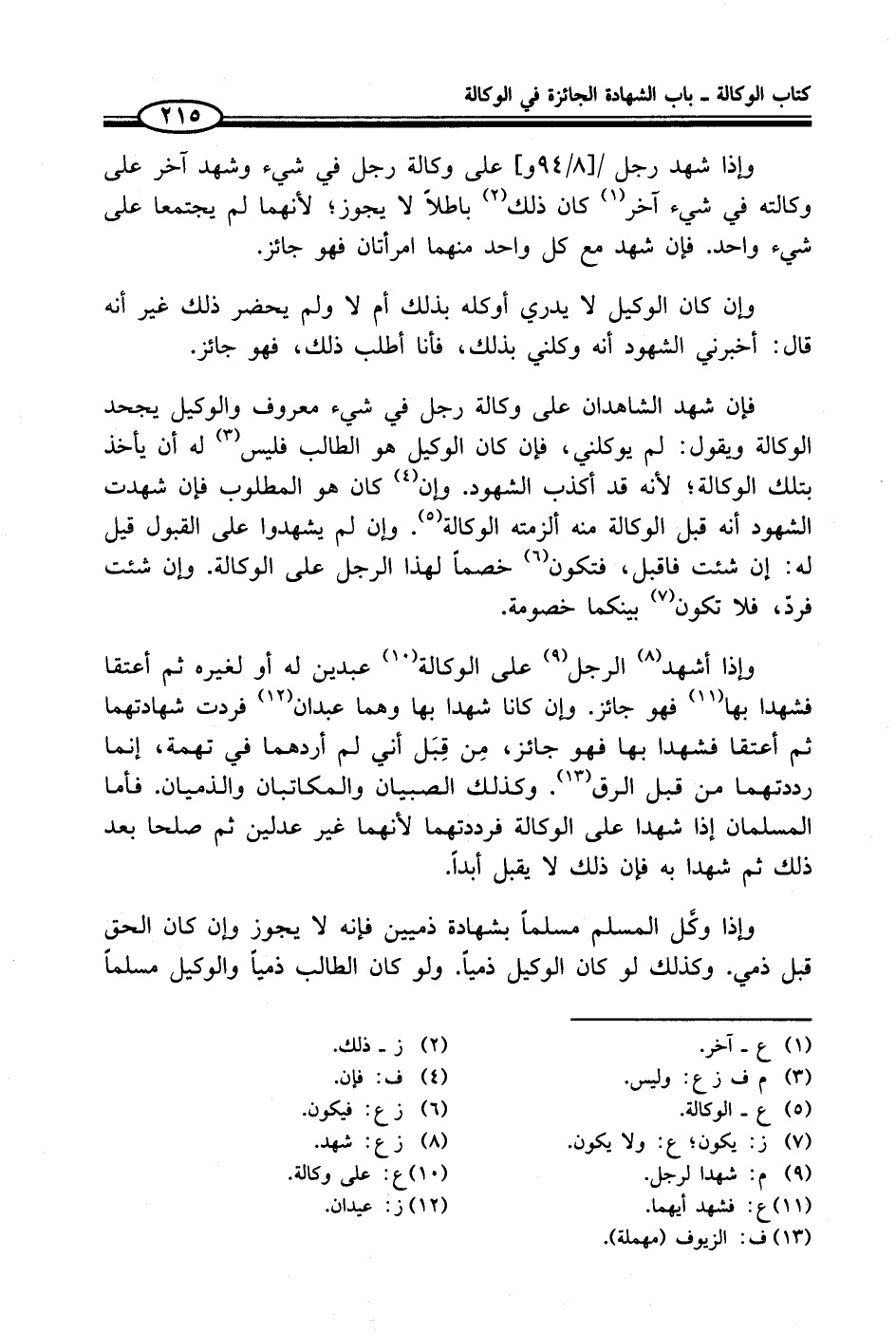 وإذا أشهد (¬8) الرجل (¬9) على الوكالة (¬10) عبدين له أو لغيره ثم أعتقا فشهدا بها (¬11) فهو جائز. وإن كانا شهدا بها وهما عبدان (¬12) فردت شهادتهما ثم أعتقا فشهدا بها فهو جائز، مِن قِبَل أني لم أردهما في تهمة، إنما رددتهما من قبل الرق (¬13). وكذلك الصبيان والمكاتبان والذميان. فأما المسلمان إذا شهدا على الوكالة فرددتهما لأنهما غير عدلين ثم صلحا بعد ذلك ثم شهدا به فإن ذلك لا يقبل أبداً.