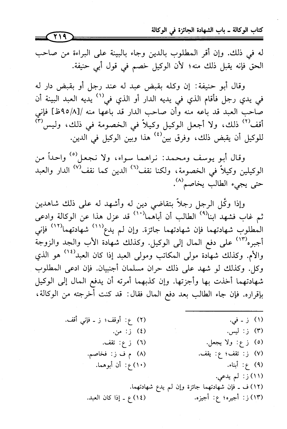 وقال أبو يوسف ومحمد: نراهما سواء، ولا نجعل (¬5) واحداً من الوكيلين وكيلاً في الخصومة، ولكنا نقف (¬6) الدين كما نقف (¬7) الدار والعبد حتى يجيء الطالب يخاصم (¬8).