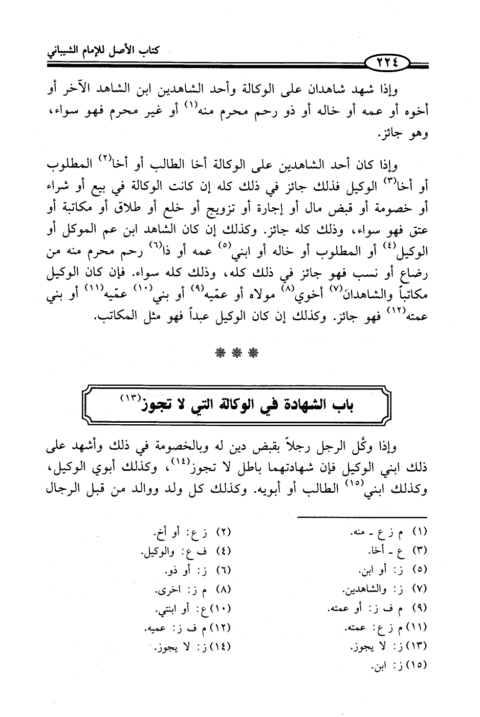 وإذا وكَّل الرجل رجلاً بقبض دين له وبالخصومة في ذلك وأشهد على ذلك ابني الوكيل فإن شهادتهما باطل لا تجوز (¬14)، وكذلك أبوي الوكيل، وكذلك ابني (¬15) الطالب أو أبويه. وكذلك كل ولد ووالد من قبل الرجال