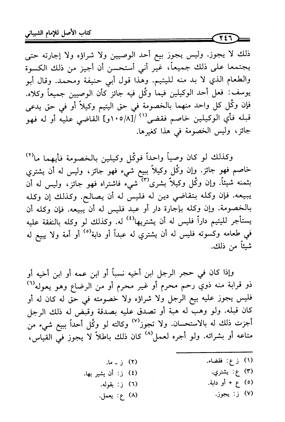 ذلك لا يجوز. وليس يجوز بيع أحد الوصيين ولا شراؤه ولا إجارته حتى يجتمعا على ذلك جميعاً، غير أني أستحسن أن أجيز من ذلك الكسوة والطعام الذي لا بد منه لليتيم. وهذا قول أبي حنيفة ومحمد. وقال أبو يوسف: فعل أحد الوكيلين فيما وكَّل فيه جائز كأن الوصيين جميعاً وكلاه. فإن وكَّل كل واحد منهما بالخصومة في حق اليتيم وكيلاً أو في حق يدعى قبله فأي الوكيلين خاصم فقضى (¬1) القاضي عليه أو له فهو جائز، وليس الخصومة في هذا كغيرها.
