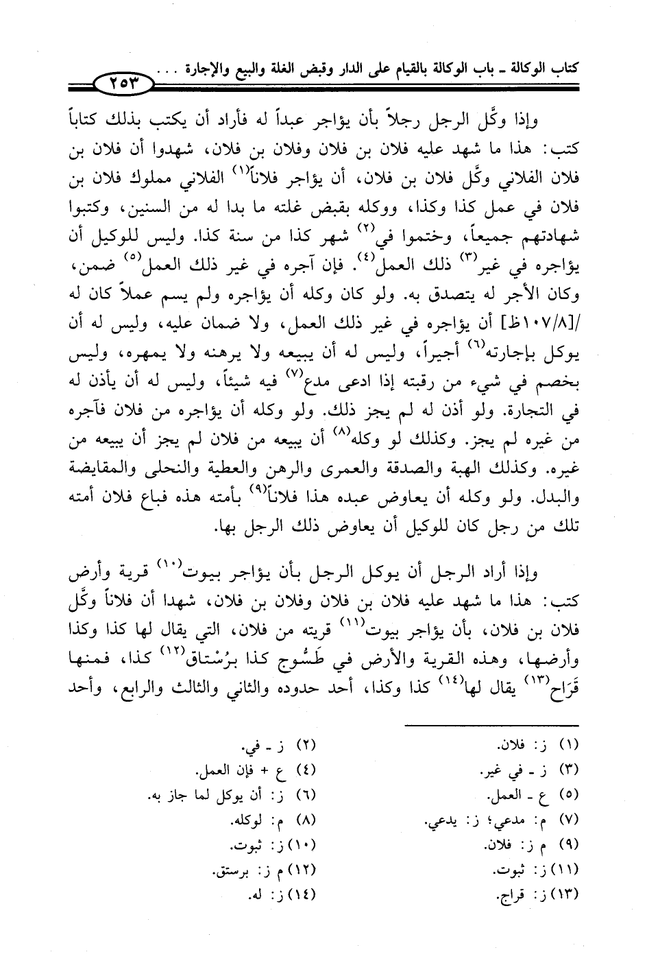 وإذا أراد الرجل أن يوكل الرجل بأن يؤاجر بيوت (¬10) قرية وأرض كتب: هذا ما شهد عليه فلان بن فلان وفلان بن فلان، شهدا أن فلاناً وكَّل فلان بن فلان، بأن يؤاجر بيوت (¬11) قريته من فلان، التي يقال لها كذا وكذا وأرضها، وهذه القرية والأرض في طَسُّوج كذا برُسْتاق (¬12) كذا، فمنها قَرَاح (¬13) يقال لها (¬14) كذا وكذا، أحد حدوده والثاني والثالث والرابع، وأحد