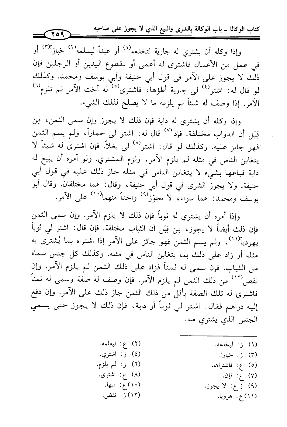 وإذا وكله أن يشتري له جارية لتخدمه (¬1) أو عبداً ليسلمه (¬2) خبازًا (¬3) أو في عمل من الأعمال فاشترى له أعمى أو مقطوع اليدين أو الرجلين فإن ذلك لا يجوز على الآمر في قول أبي حنيفة وأبي يوسف ومحمد. وكذلك لو قال له: اشتر (¬4) لي جارية أطؤها، فاشترى (¬5) له أخت الآمر لم تلزم (¬6) الآمر. إذا وصف له شيئاً لم يلزمه ما لا يصلح لذلك الشيء.