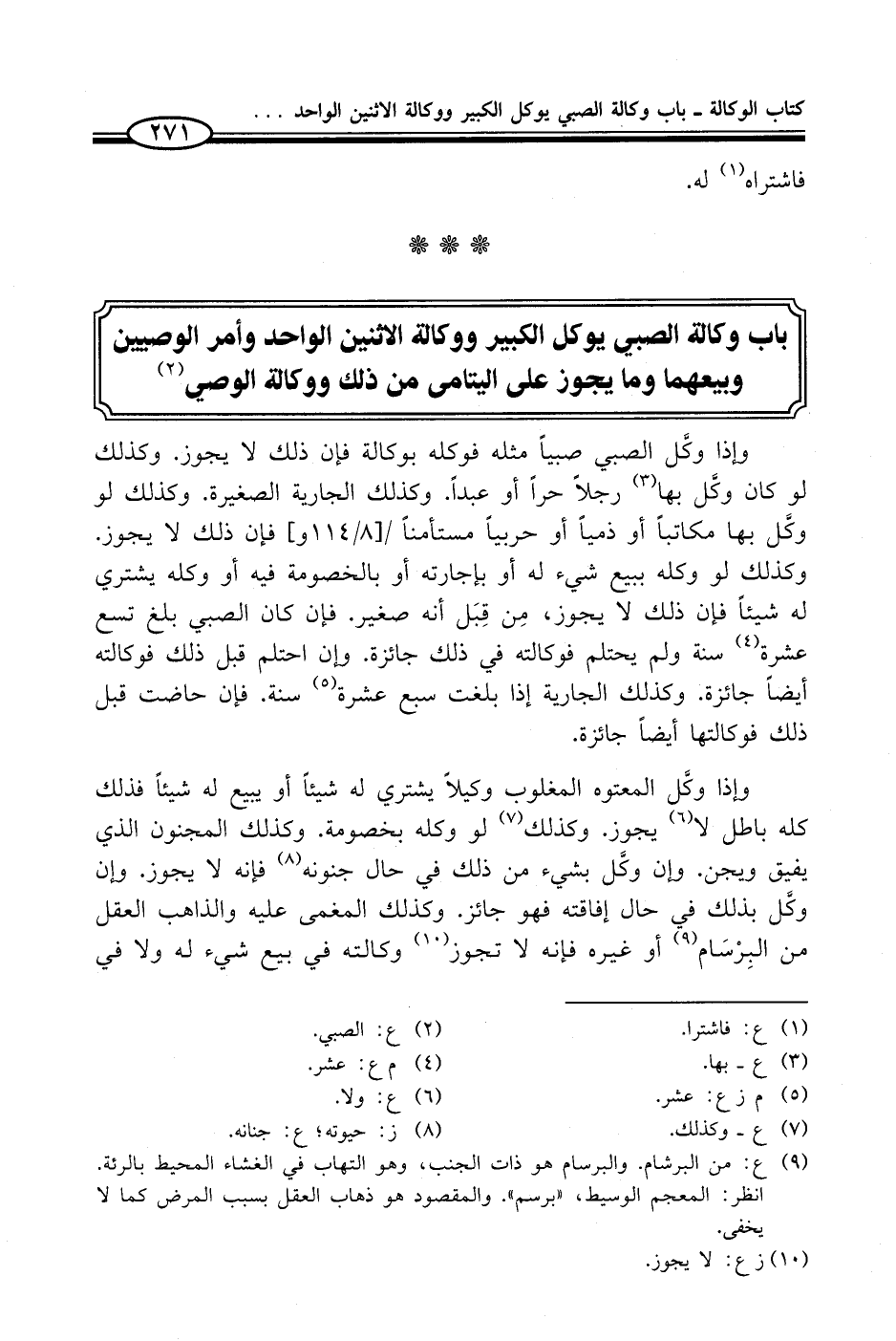 وإذا وكَّل الصبي صبياً مثله فوكله بوكالة فإن ذلك لا يجوز. وكذلك لو كان وكَّل بها (¬3) رجلاً حراً أوعبدًا. وكذلك الجارية الصغيرة. وكذلك لو وكَّل بها مكاتباً أو ذمياً أو حربياً مستأمناً فإن ذلك لا يجوز. وكذلك لو وكله ببيع شيء له أو بإجارته أو بالخصومة فيه أو وكله يشتري له شميئًا فإن ذلك لا يجوز، مِن قِبَل أنه صغير. فإن كان الصبي بلغ تسع عشرة (¬4) سنة ولم يحتلم فوكالته في ذلك جائزة. وإن احتلم قبل ذلك فوكالته أيضاً جائزة. وكذلك الجارية إذا بلغت سبع عشرة (¬5) سنة. فإن حاضت قبل ذلك فوكالتها أيضاً جائزة.