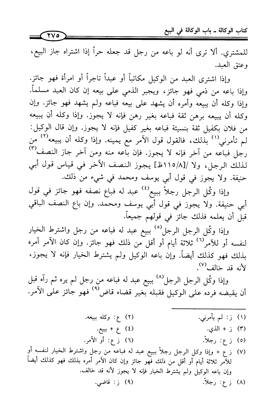 (¬7) ز ع + وإذا وكل الرجل رجلاً ببيع عبد له فباعه من رجل واشترط الخيار لنفسه أو للآمر ثلاثة أيام أو أقل من ذلك فهو جائز وإن كان الآمر أمره بذلك فهو كذلك أيضاً فإن باعه الوكيل ولم يشترط الخيار فإنه لا يجوز لأنه قد خالف.