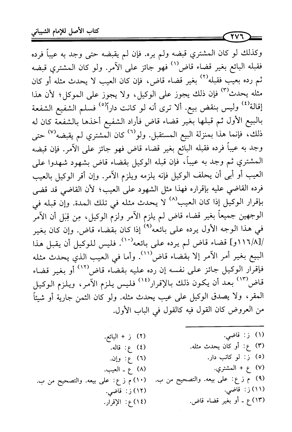 وكذلك لو كان المشتري قبضه ولم يره. فإن لم يقبضه حتى وجد به عيباً فرده فقبله البائع بغير قضاء قاض (¬1) فهو جائز على الآمر. ولو كان المشتري قبضه ثم رده بعيب فقبله (¬2) بغير قضاء قاض، فإن كان العيب لا يحدث مثله أو كان مثله يحدث (¬3) فإن ذلك يجوز على الوكيل، ولا يجوز على الموكل؛ لأن هذا إقالة (¬4) وليس بنقض بيع. ألا ترى أنه لوكانت داراً (¬5) فسلم الشفيع الشفعة بالبيع الأول ثم قبلها بغير قضاء قاض فأراد الشفيع أخذها بالشفعة كان له ذلك، فإنما هذا بمنزلة البيع المستقبل. ولو (¬6) كان المشتري لم يقبضه (¬7) حتى وجد به عيباً فرده فقبله البائع بغير قضاء قاض فهو جائز على الآمر. فإن قبضه المشتري ثم وجد به عيباً، فإن قبله الوكيل بقضاء قاض بشهود شهدوا على العيب أو أبى أن يحلف الوكيل فإنه يلزمه ويلزم الآمر. وإن أقر الوكيل بالعيب فرده القاضي عليه بإقراره فهذا مثل الشهود على العيب؛ لأن القاضي قد قضى بإقرار الوكيل إذا كان العيب (¬8) لا يحدث مثله في تلك المدة. وإن قبله في الوجهين جميعاً بغير قضاء قاض لم يلزم الآمر ولزم الوكيل، مِن قِبَل أن الآمر في هذا الوجه الأول يرده على بائعه (¬9) إذا كان بقضاء قاض. وإن كان بغير قضاء قاض لم يرده على بائعه (¬10). فليس للوكيل أن يقبل هذا البيع بغير أمر الآمر إلا بقضاء قاض (¬11). وأما في العيب الذي يحدث مثله فإقرار الوكيل جائز على نفسه إن رده عليه بقضاء قاض (¬12) أو بغير قضاء قاض (¬13) بعد أن يكون ذلك بالإقرار (¬14) فليس يلزم الآمر، ويلزم الوكيل المقر، ولا يصدق الوكيل على عيب يحدث مثله. ولو كان الثمن جارية أو شيئاً من العروض كان القول فيه كالقول في الباب الأول.