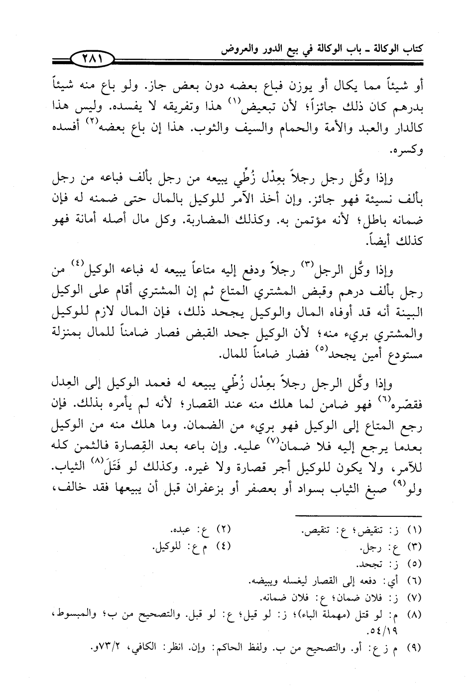 وإذا وكَّل الرجل رجلاً بعِدْل زُطّي يبيعه له فعمد الوكيل إلى العِدل فقصّره (¬6) فهو ضامن لما هلك منه عند القصار؛ لأنه لم يأمره بذلك. فإن رجع المتاع إلى الوكيل فهو بريء من الضمان. وما هلك منه من الوكيل بعدما يرجع إليه فلا ضمان (¬7) عليه. وإن باعه بعد القِصارة فالثمن كله للأمر، ولا يكون للوكيل أجر قصارة ولا غيره. وكذلك لو فَتَلَ (¬8) الثياب. ولو (¬9) صبغ الثياب بسواد أو بعصفر أو بزعفران قبل أن يبيعها فقد خالف،