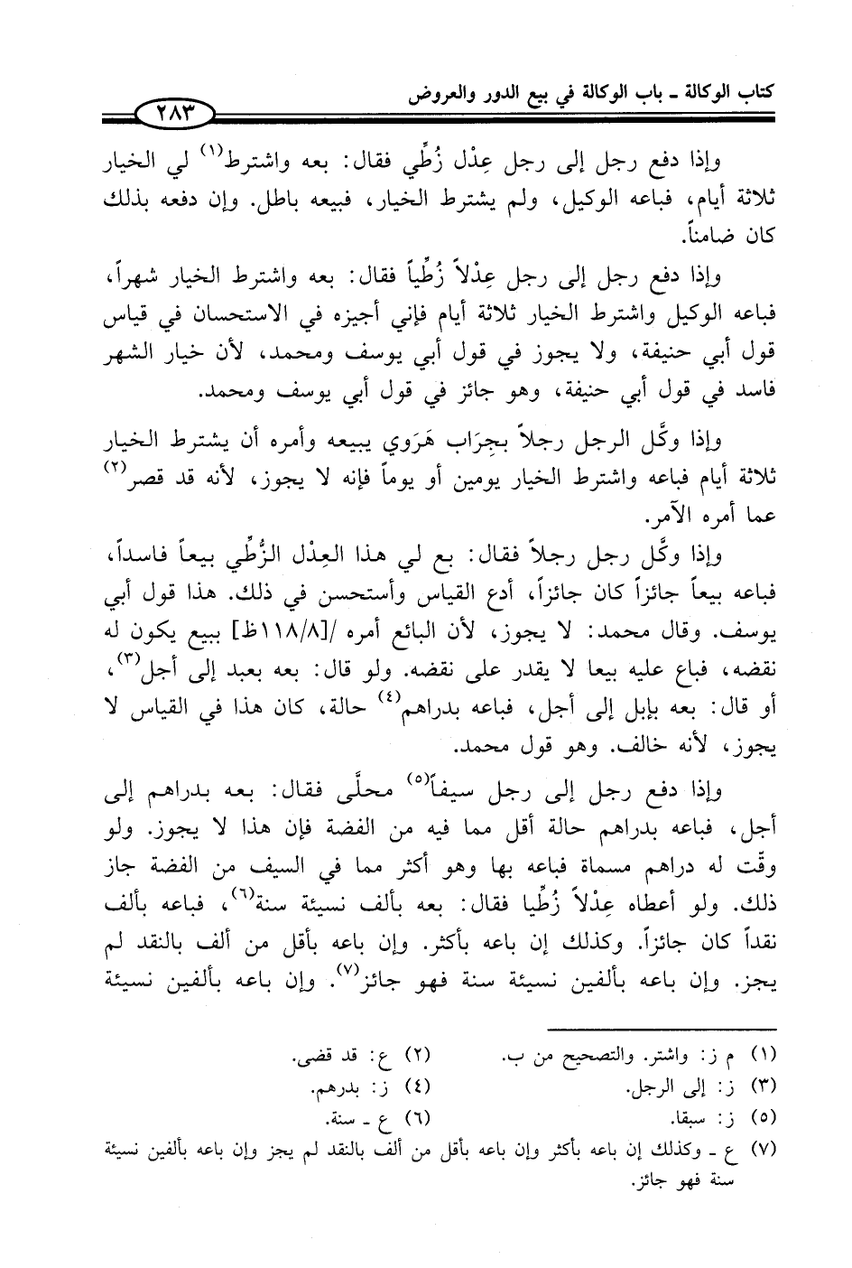 وإذا وكَّل رجل رجلاً فقال: بع لي هذا العِدْل الزُّطِّي بيعاً فاسداً، فباعه بيعاً جائزاً كان جائزاً، أدع القياس وأستحسن في ذلك. هذا قول أبي يوسف. وقال محمد: لا يجوز، لأن البائع أمره ببيع يكون له نقضه، فباع عليه بيعاً لا يقدر على نقضه. ولو قال: بعه بعبد إلى أجل (¬3)، أو قال: بعه بإبل إلى أجل، فباعه بدراهم (¬4) حالة، وإن هذا في القياس لا يجوز، لأنه خالف. وهو قول محمد.