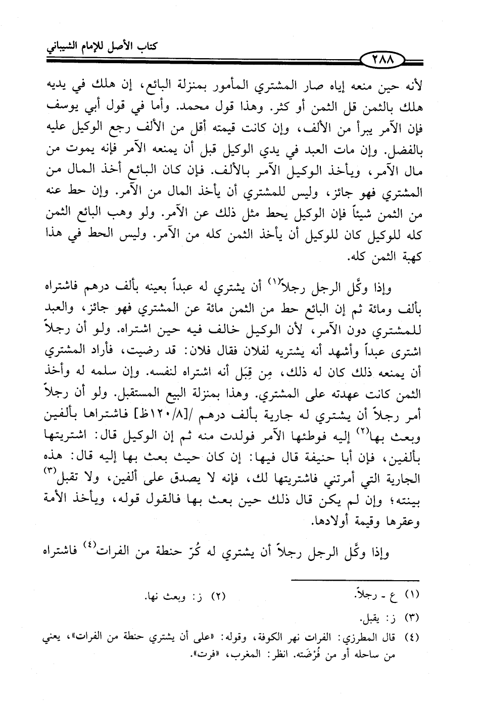 (¬4) قال المطرزي: الفرات نهر الكوفة، وقوله: "على أن يشتري حنطة من الفرات"، يعني من ساحله أومن فُرْضَته. انظر: المغرب، "فرت".