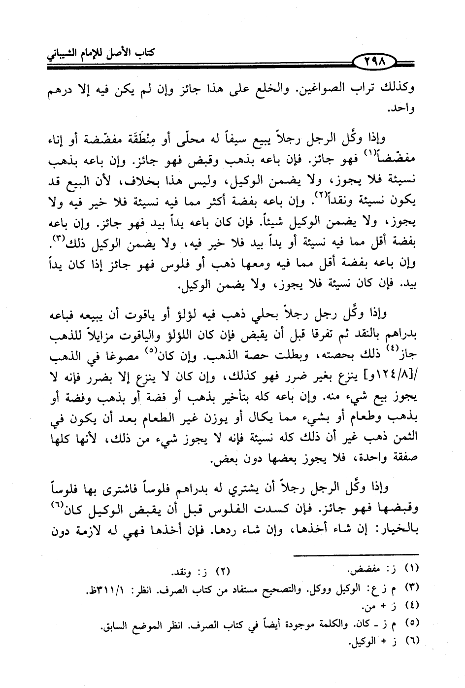 وإذا وكَّل الرجل رجلاً يبيع سيفاً له محلّى أو مِنْطَقَة مفضّضة أو إناء مففّضًا (¬1) فهو جائز. فإن باعه بذهب وقبض فهو جائز. فإن باعه بذهب نسيئة فلا يجوز، ولا يضمن الوكيل، وليس هذا بخلاف، لأن البيع قد يكون نسيئة ونقداً (¬2). وإن باعه بفضة أكثر مما فيه نسيئة فلا خير فيه ولا يجوز، ولا يضمن الوكيل شيئاً. فإن كان باعه يداً بيد فهو جائز. وإن باعه بفضة أقل مما فيه نسيئة أو يداً بيد فلا خير فيه، ولا يضمن الوكيل ذلك (¬3). وإن باعه بفضة أقل مما فيه ومعها ذهب أو فلوس فهو جائز إذا كان يداً بيد. فإن كان نسيئة فلا يجوز، ولا يضمن الوكيل.