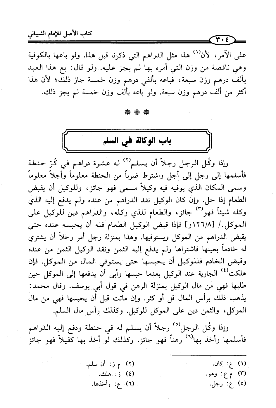 وإذا وكَّل الرجل رجلاً أن يسلم (¬2) له عشرة دراهم في كُرّ حنطة فأسلمها إلى رجل إلى أجل واشترط ضرباً من الحنطة معلوماً وأجلاً معلوماً وسمى المكان الذي يوفيه فيه وكيلاً مسمى فهو جائز، وللوكيل أن يقبض الطعام إذا حل. وإن كان الوكيل نقد الدراهم من عنده ولم يدفع إليه الذي وكله شيئاً فهو (¬3) جائز، والطعام للذي وكله، والدراهم دين للوكيل على الموكل. فإذا قبض الوكيل الطعام فله أن يحبسه عنده حتى يقبض الدراهم من الموكل ويستوفيها. وهذا بمنزلة رجل أمر رجلاً أن يشتري له خادماً بعينها فاشتراها ولم يدفع إليه الثمن ونقد الوكيل الثمن من عنده وقبض الخادم فللوكيل أن يحبسها حتى يستوفي المال من الموكل. فإن هلكت (¬4) الجارية عند الوكيل بعدما حبسها وأبى أن يدفعها إلى الموكل حين طلبها فهي من مال الوكيل بمنزلة الرهن في قول أبي يوسف. وقال محمد: يذهب ذلك برأس المال قل أو كثر. وإن ماتت قبل أن يحبسها فهي من مال الموكل، والثمن دين على الموكل للوكيل. وكذلك رأس مال السلم.