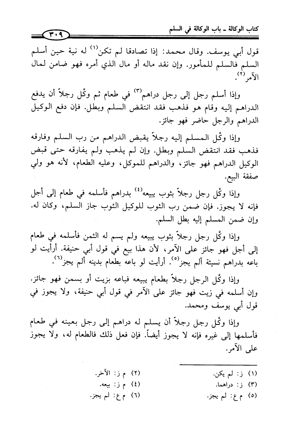 قول أبي يوسف. وقال محمد: إذا تصادقا لم تكن (¬1) له نية حين أسلم السلم فالسلم للمأمور. وإن نقد ماله أو مال الذي أمره فهو ضامن لمال الآمر (¬2).