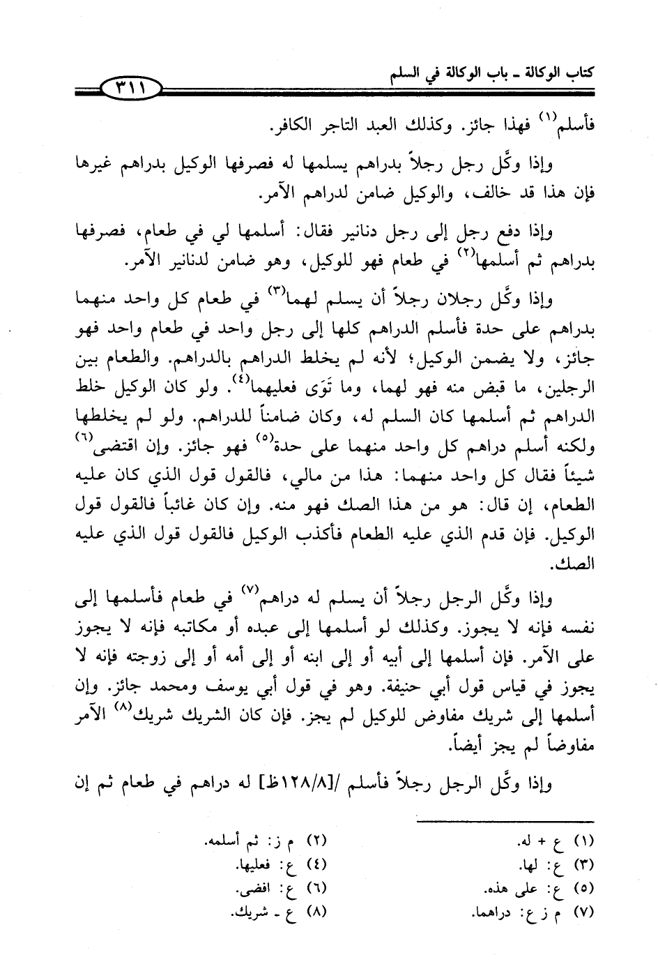 وإذا وكَّل الرجل رجلاً أن يسلم له دراهم (¬7) في طعام فأسلمها إلى نفسه فإنه لا يجوز. وكذلك لو أسلمها إلى عبده أو مكاتبه فإنه لا يجوز على الآمر. فإن أسلمها إلى أبيه أو إلى ابنه أو إلى أمه أو إلى زوجته فإنه لا يجوز في قياس قول أبي حنيفة. وهو في قول أبي يوسف ومحمد جائز. وإن أسلمها إلى شريك مفاوض للوكيل لم يجز. فإن كان الشريك شريك (¬8) الآمر مفاوضاً لم يجز أيضاً.