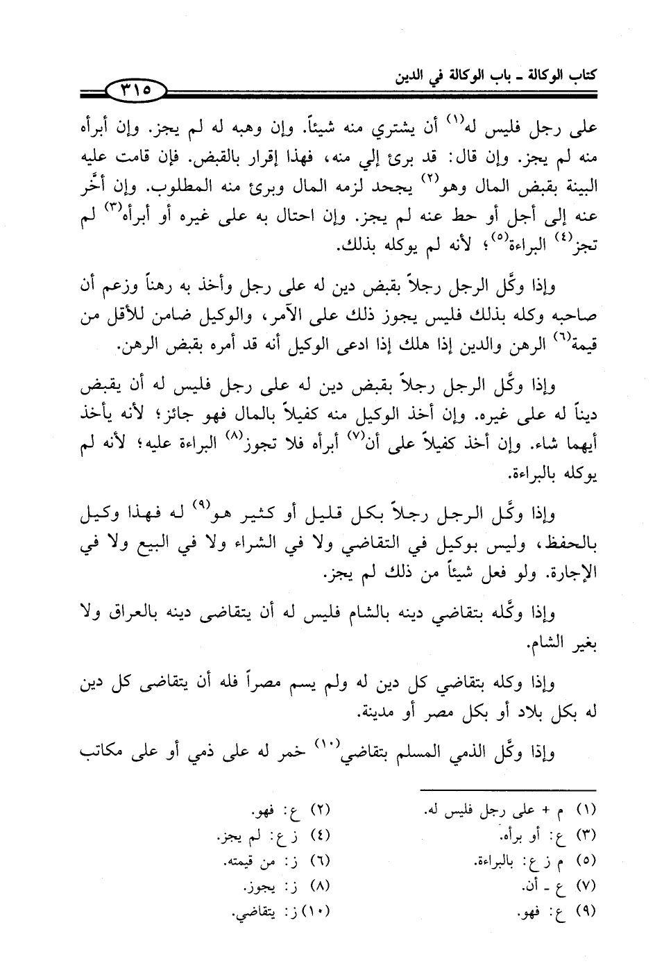 وإذا وكَّل الرجل رجلاً بقبض دين له على رجل فليس له أن يقبض ديناً له على غيره. وإن أخذ الوكيل منه كفيلاً بالمال فهو جائزة لأنه يأخذ أيهما شاء. وإن أخذ كفيلاً على أن (¬7) أبرأه فلا تجوز (¬8) البراءة عليه؛ لأنه لم يوكله بالبراءة.