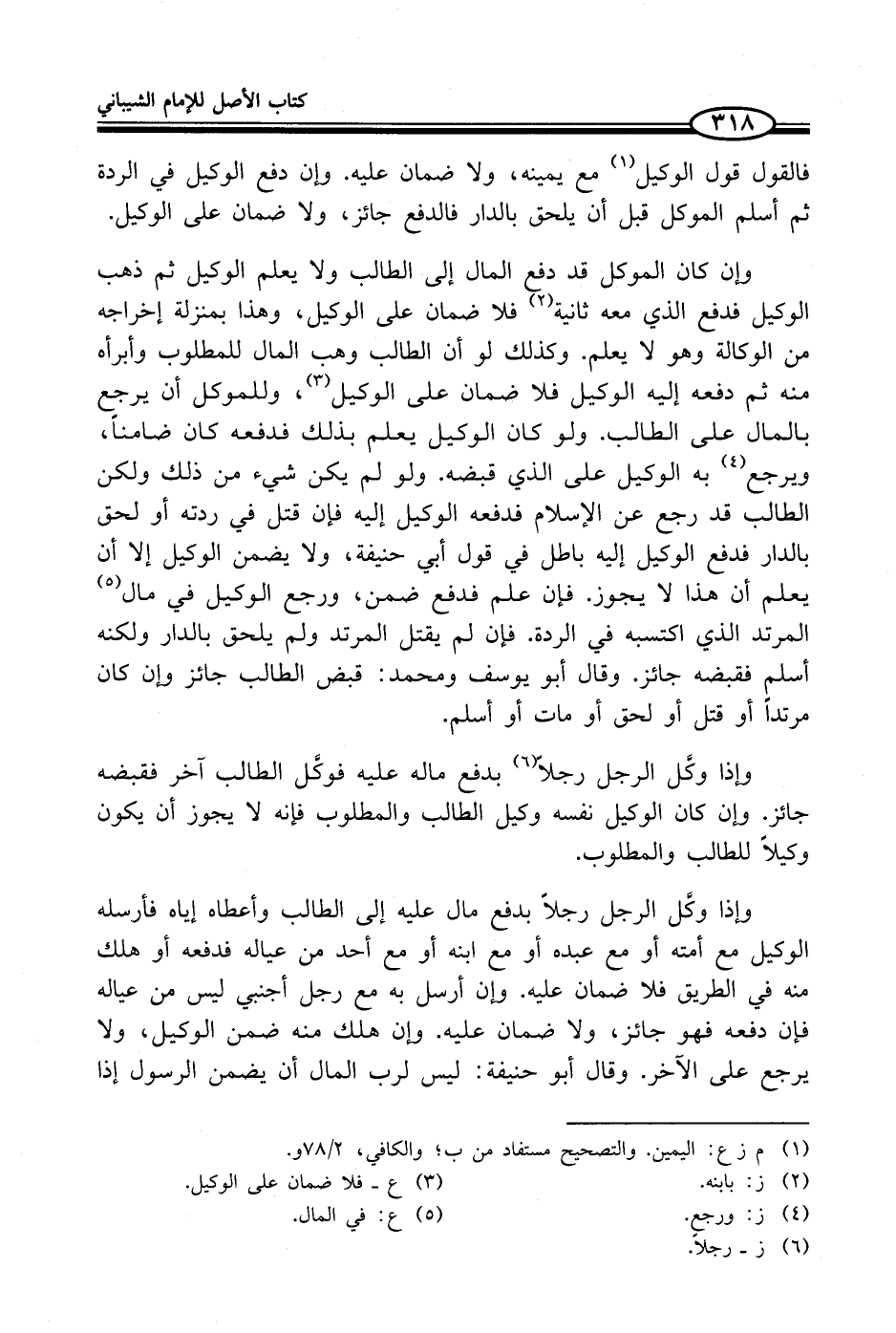 وإن كان الموكل قد دفع المال إلى الطالب ولا يعلم الوكيل ثم ذهب الوكيل فدفع الذي معه ثانية (¬2) فلا ضمان على الوكيل، وهذا بمنزلة إخراجه من الوكالة وهو لا يعلم. وكذلك لو أن الطالب وهب المال للمطلوب وأبرأه منه ثم دفعه إليه الوكيل فلا ضمان على الوكيل (¬3)، وللموكل أن يرجع بالمال على الطالب. ولو كان الوكيل يعلم بذلك فدفعه كان ضامناً، ويرجع (¬4) به الوكيل على الذي قبضه. ولو لم يكن شيء من ذلك ولكن الطالب قد رجع عن الإسلام فدفعه الوكيل إليه فإن قتل في ردته أو لحق بالدار فدفع الوكيل إليه باطل في قول أبي حنيفة، ولا يضمن الوكيل إلا أن يعلم أن هذا لا يجوز. فإن علم فدفع ضمن، ورجع الوكيل في مال (¬5) المرتد الذي اكتسبه في الردة. فإن لم يقتل المرتد ولم يلحق بالدار ولكنه أسلم فقبضه جائز. وقال أبو يوسف ومحمد: قبض الطالب جائز وإن كان مرتداً أو قتل أو لحق أو مات أو أسلم.
