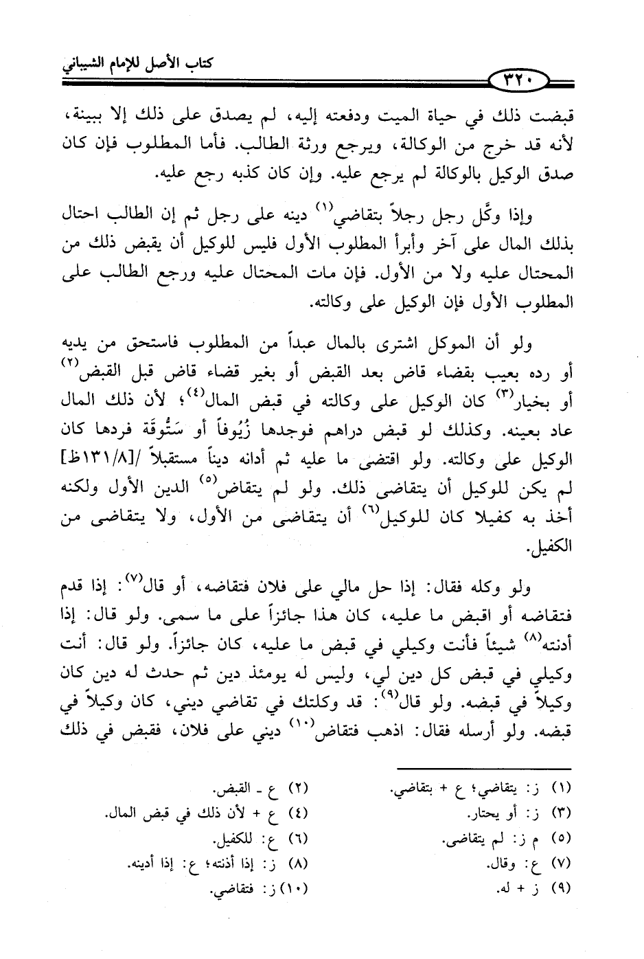 ولو أن الموكل اشترى بالمال عبداً من المطلوب فاستحق من يديه أو رده بعيب بقضاء قاض بعد القبض أو بغير قضاء قاض قبل القبض (¬2) أو بخيار (¬3) كان الوكيل على وكالته في قبض المال (¬4)؛ لأن ذلك المال عاد بعينه. وكذلك لو قبض دراهم فوجدها زُيوفًا أو سَتُّوقَة فردها كان الوكيل على وكالته. ولو اقتضى ما عليه ثم أدانه ديناً مستقبلاً لم يكن للوكيل أن يتقاضى ذلك. ولو لم يتقاض (¬5) الدين الأول ولكنه أخذ به كفيلا كان للوكيل (¬6) أن يتقاضى من الأول، ولا يتقاضى من الكفيل.