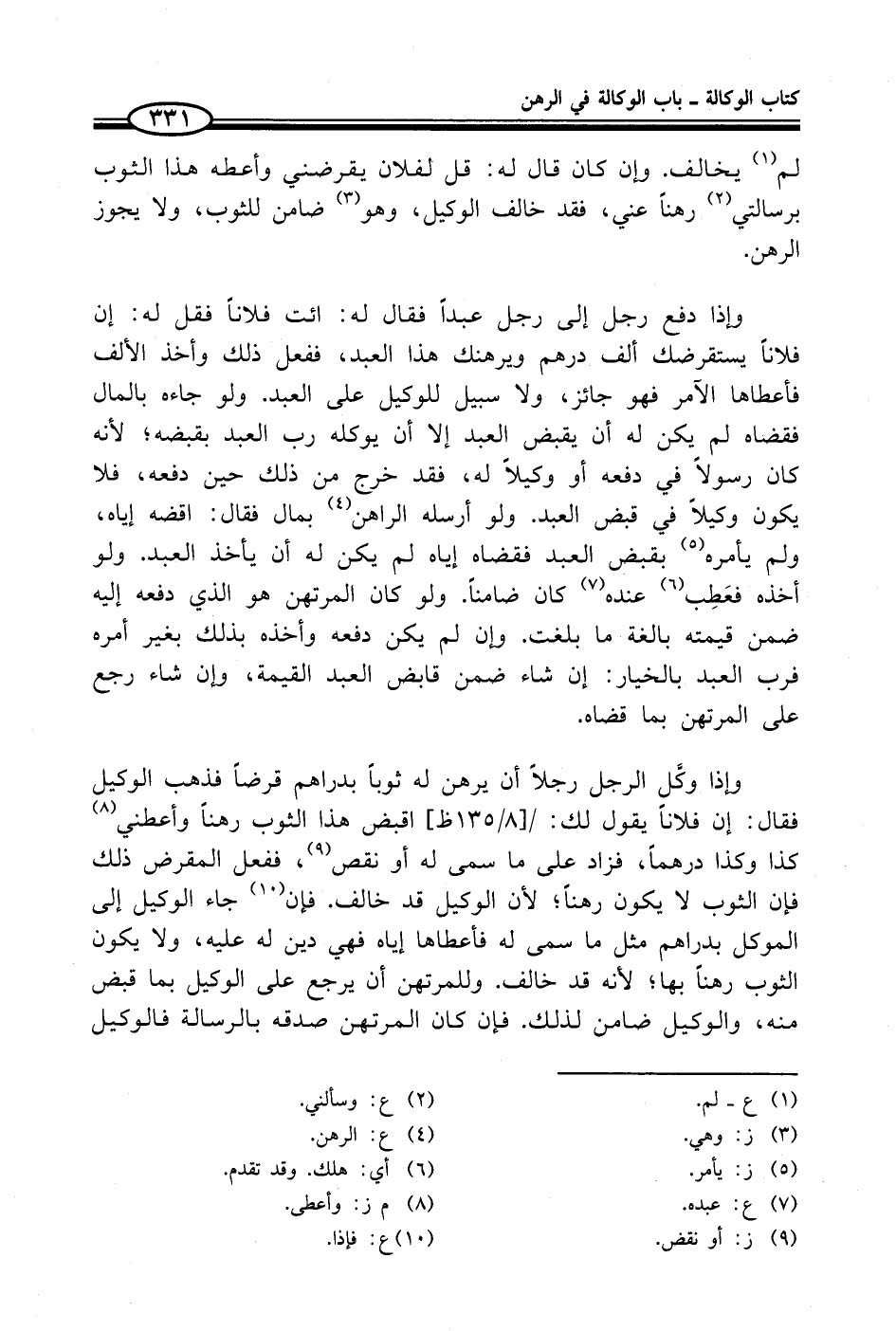 وإذا وكَّل الرجل رجلاً أن يرهن له ثوباً بدراهم قرضاً فذهب الوكيل فقال: إن فلاناً يقول لك: اقبض هذا الثوب رهناً وأعطني (¬8) كذا وكذا درهماً، فزاد على ما سمى له أو نقص (¬9)، ففعل المقرض ذلك فإن الثوب لا يكون رهناً؛ لأن الوكيل قد خالف. فإن (¬10) جاء الوكيل إلى الموكل بدراهم مثل ما سمى له فأعطاها إياه فهي دين له عليه، ولا يكون الثوب رهناً بها؛ لأنه قد خالف. وللمرتهن أن يرجع على الوكيل بما قبض منه، والوكيل ضامن لذلك. فإن كان المرتهن صدقه بالرسالة فالوكيل