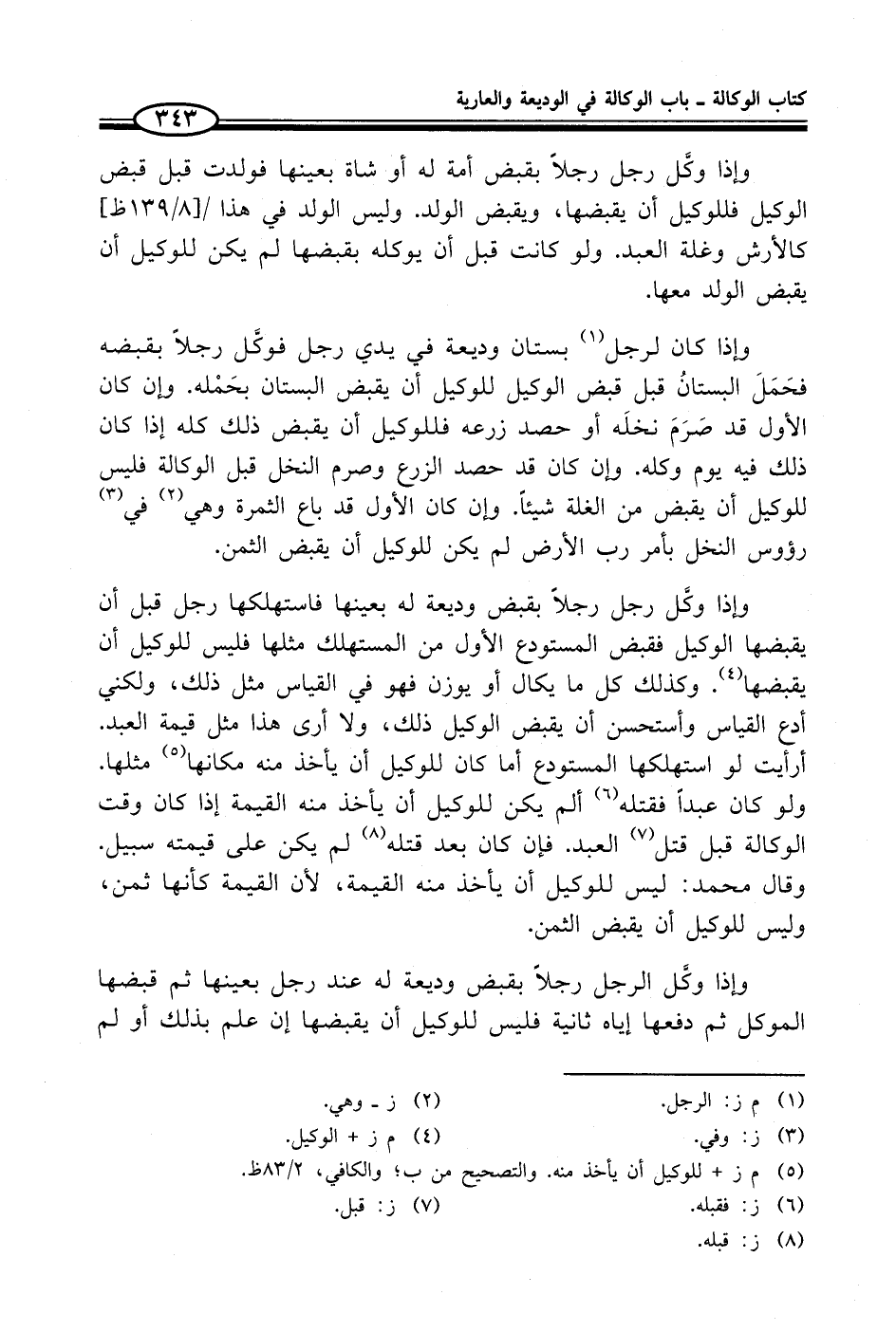 وإذا وكَّل رجل رجلاً بقبض وديعة له بعينها فاستهلكها رجل قبل أن يقبضها الوكيل فقبض المستودع الأول من المستهلك مثلها فليس للوكيل أن يقبضها (¬4). وكذلك كل ما يكال أو يوزن فهو في القياس مثل ذلك، ولكني أدع القياس وأستحسن أن يقبض الوكيل ذلك، ولا أرى هذا مثل قيمة العبد. أرأيت لو استهلكها المستودع أما كان للوكيل أن يأخذ منه مكانها (¬5) مثلها. ولو كان عبداً فقتله (¬6) ألم يكن للوكيل أن يأخذ منه القيمة إذا كان وقت الوكالة قبل قتل (¬7) العبد. فإن كان بعد قتله (¬8) لم يكن على قيمته سبيل. وقال محمد: ليس للوكيل أن يأخذ منه القيمة، لأن القيمة كأنها ثمن، وليس للوكيل أن يقبض الثمن.