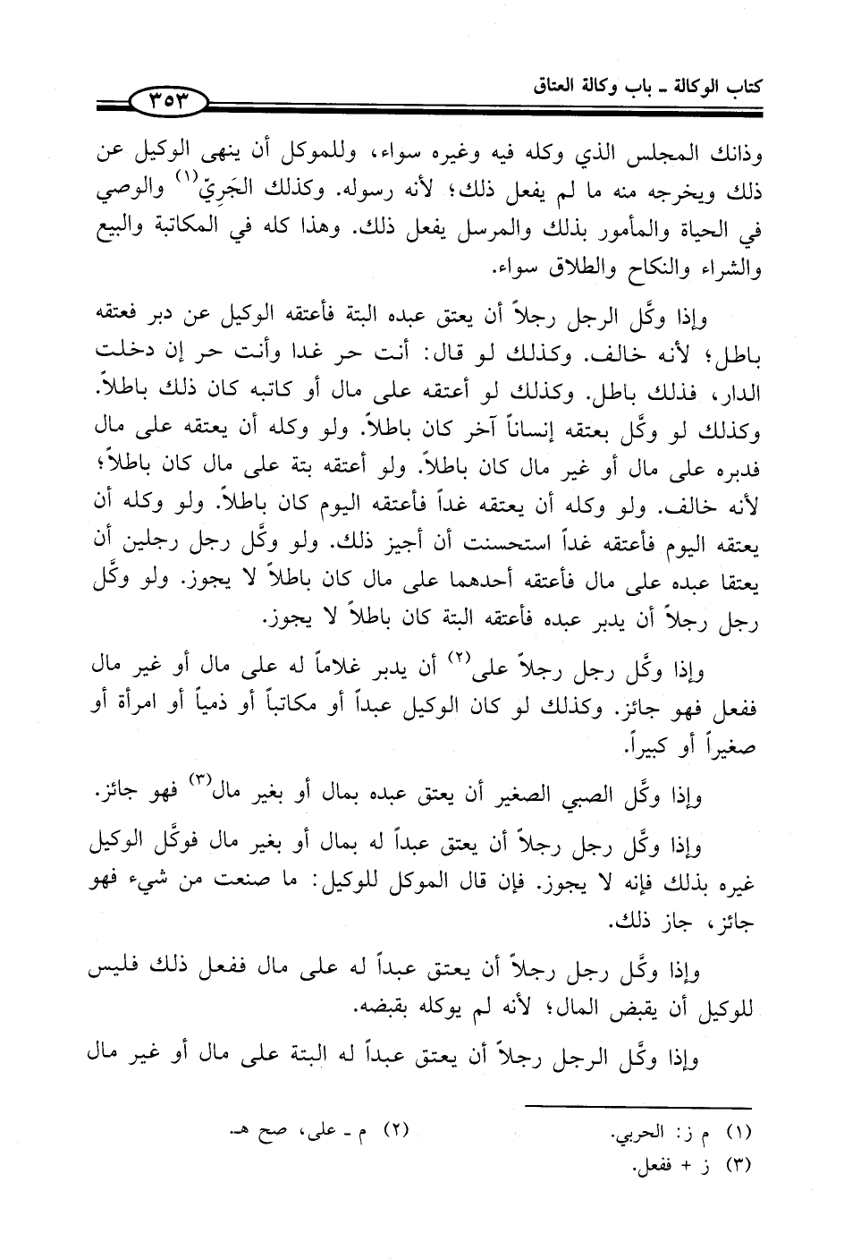وإذا وكَّل الرجل رجلاً أن يعتق عبده البتة فأعتقه الوكيل عن دبر فعتقه باطل؛ لأنه خالف. وكذلك لو قال: أنت حر غدا وأنت حر إن دخلت الدار، فذلك باطل. وكذلك لو أعتقه على مال أو كاتبه كان ذلك باطلاً. وكذلك لو وكَّل بعتقه إنساناً آخر كان باطلاً. ولو وكله أن يعتقه على مال فدبره على مال أو غير مال كان باطلاً. ولو أعتقه بتة على مال كان باطلاً؛ لأنه خالف. ولو وكله أن يعتقه غداً فأعتقه اليوم كان باطلاً. ولو وكله أن يعتقه اليوم فأعتقه غداً أستحسنت أن أجيز ذلك. ولو وكَّل رجل رجلين أن يعتقا عبده على مال فأعتقه أحدهما على مال كان باطلاً لا يجوز. ولو وكَّل رجل رجلاً أن يدبر عبده فأعتقه البتة كان باطلاً لا يجوز.