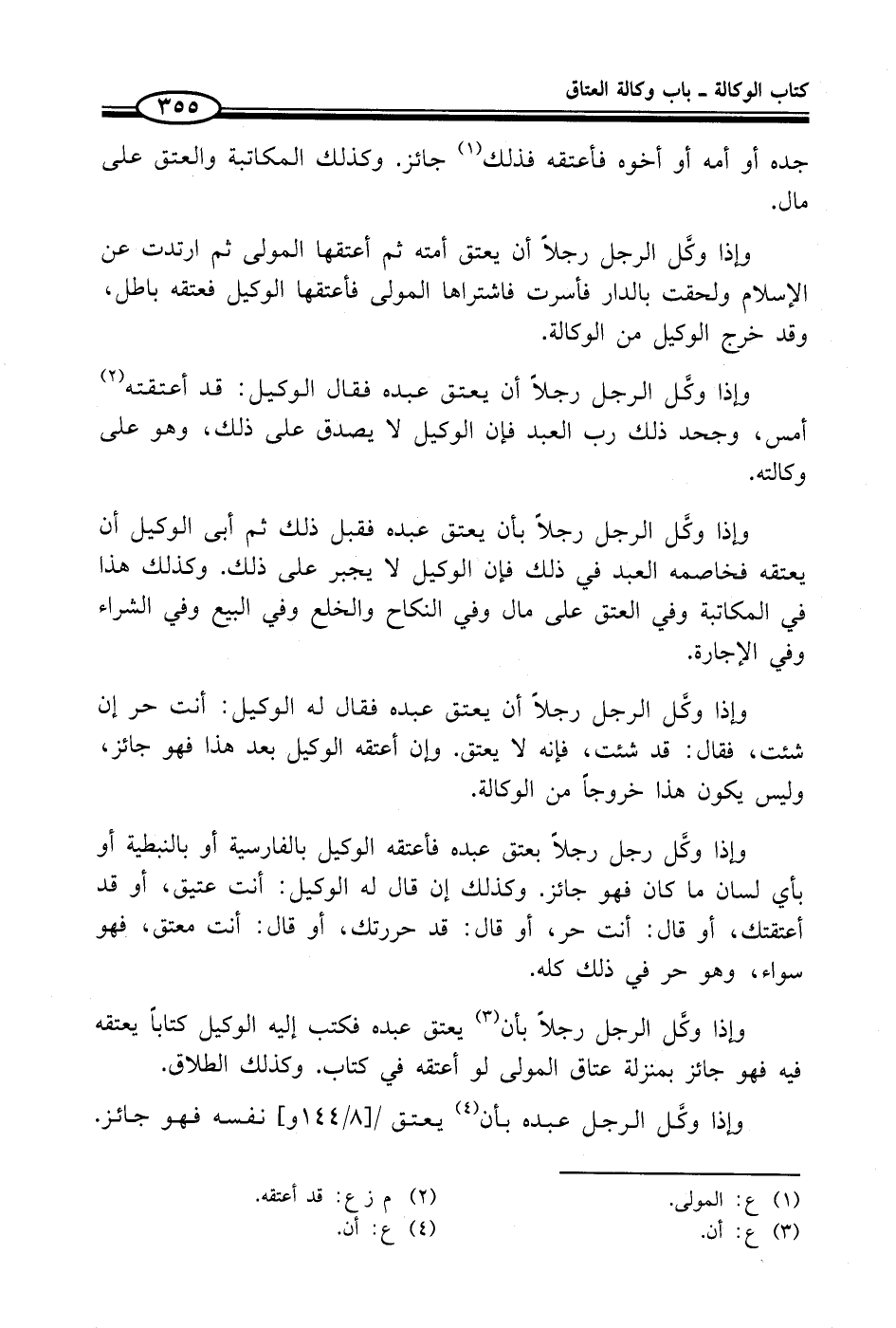 وإذا وكَّل رجل رجلاً بعتق عبده فأعتقه الوكيل بالفارسية أو بالنبطية أو بأي لسان ما كان فهو جائز. وكذلك إن قال له الوكيل: أنت عتيق، أو قد أعتقتك، أو قال: أنت حر، أو قال: قد حررتك، أو قال: أنت معتق، فهو سواء، وهو حر في ذلك كله.
