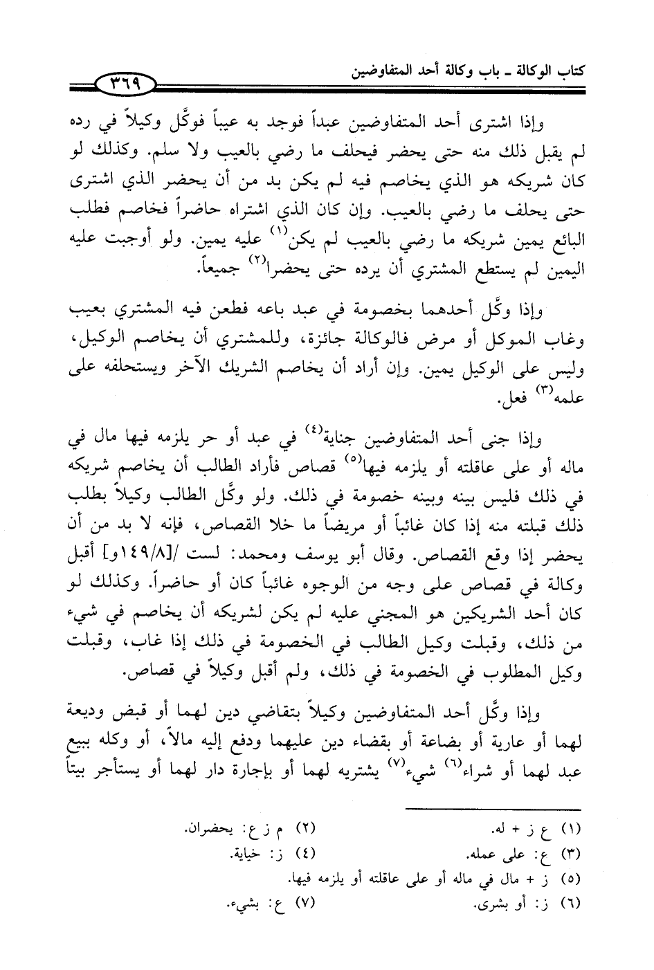 وإذا جنى أحد المتفاوضين جناية (¬4) في عبد أو حر يلزمه فيها مال في ماله أو على عاقلته أو يلزمه فيها (¬5) قصاص فأراد الطالب أن يخاصم شريكه في ذلك فليس بينه وبينه خصومة في ذلك. ولو وكَّل الطالب وكيلاً بطلب ذلك قبلته منه إذا كان غائباً أو مريضاً ما خلا القصاص، فإنه لا بد من أن يحضر إذا وقع القصاص. وقال أَبو يوسف ومحمد: لست أقبل وكالة في قصاص على وجه من الوجوه غائباً كان أو حاضراً. وكذلك لو كان أحد الشريكين هو المجني عليه لم يكن لشريكه أن يخاصم في شيء من ذلك، وقبلت وكيل الطالب في الخصومة في ذلك إذا غاب، وقبلت وكيل المطلوب في الخصومة في ذلك، ولم أقبل وكيلاً في قصاص.