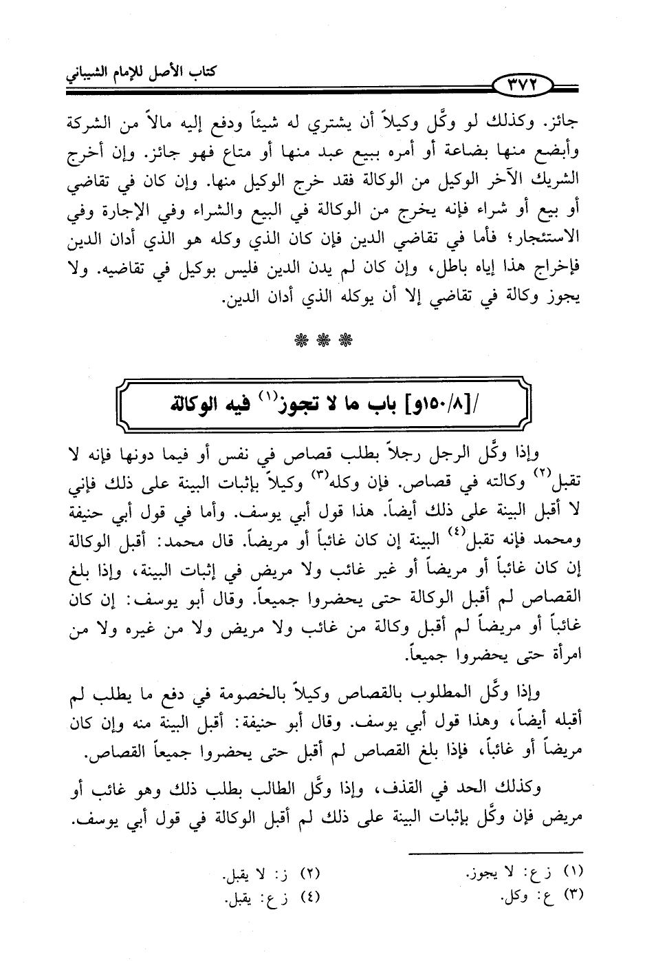 وإذا وكَّل الرجل رجلاً بطلب قصاص في نفس أو فيما دونها فإنه لا تقبل (¬2) وكالته في قصاص. فإن وكله (¬3) وكيلاً بإثبات البينة على ذلك فإني لا أقبل البينة على ذلك أيضاً. هذا قول أبي يوسف. وأما في قول أبي حنيفة ومحمد فإنه تقبل (¬4) البينة إن كان غائباً أو مريضاً. قال محمد: أقبل الوكالة إن كان غائباً أو مريضاً أو غير غائب ولا مريض في إثبات البينة، وإذا بلغ القصاص لم أقبل الوكالة حتى يحضروا جميعاً. وقال أَبو يوسف: إن كان غائباً أو مريضاً لم أقبل وكالة من غائب ولا مريض ولا من غيره ولا من امرأة حتى يحضروا جميعاً.