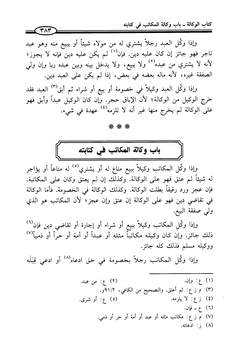 وإذا وكَّل المكاتب وكيلاً ببيع أو شراء أو إجارة أو تقاضي دين فإن (¬6) ذلك جائز. وإن كان وكيله مكاتباً مثله أو عبداً أو أمة أو حراً أو ذمياً (¬7) ووكيله مسلم فذلك كله جائز.