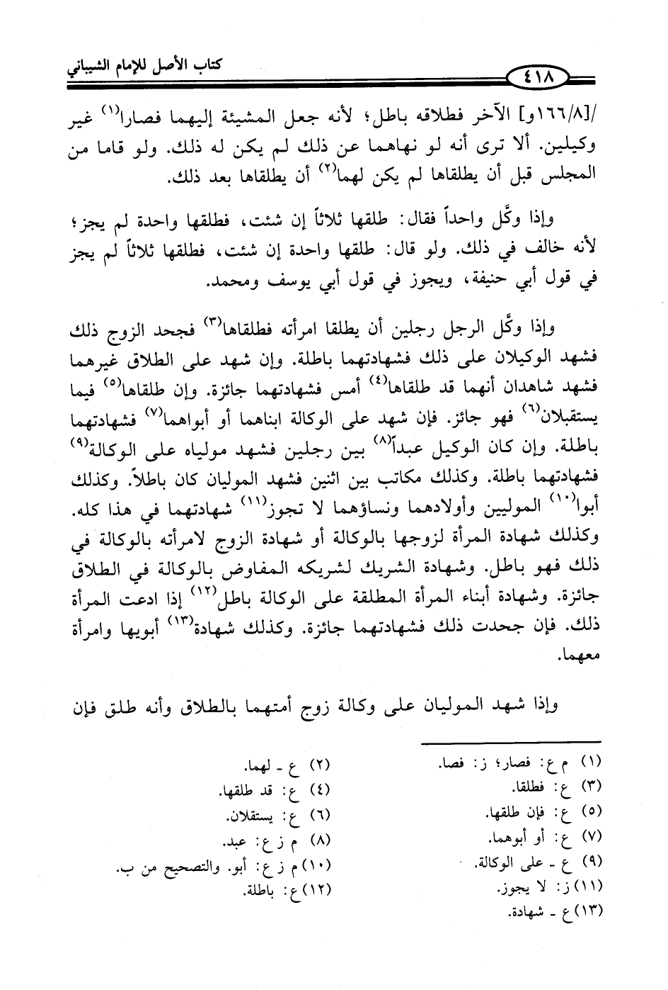 وإذا وكَّل الرجل رجلين أن يطلقا امرأته فطلقاها (¬3) فجحد الزوج ذلك فشهد الوكيلان على ذلك فشهادتهما باطلة. وإن شهد على الطلاق غيرهما فشهد شاهدان أنهما قد طلقاها (¬4) أمس فشهادتهما جائزة. وإن طلقاها (¬5) فيما يستقبلان (¬6) فهو جائز. فإن شهد على الوكالة ابناهما أو أبواهما (¬7) فشهادتهما باطلة. وإن كان الوكيل عبداً (¬8) بين رجلين فشهد مولياه على الوكالة (¬9) فشهادتهما باطلة. وكذلك مكاتب بين اثنين فشهد الموليان كان باطلاً. وكذلك أبوا (¬10) الموليين وأولادهما ونساؤهما لا تجوز (¬11) شهادتهما في هذا كله. وكذلك شهادة المرأة لزوجها بالوكالة أو شهادة الزوج لامرأته بالوكالة في ذلك فهو باطل. وشهادة الشريك لشريكه المفاوض بالوكالة في الطلاق جائزة. وشهادة أبناء المرأة المطلقة على الوكالة باطل (¬12) إذا ادعت المرأة ذلك. فإن جحدت ذلك فشهادتهما جائزة. وكذلك شهادة (¬13) أبويها وامرأة معهما.