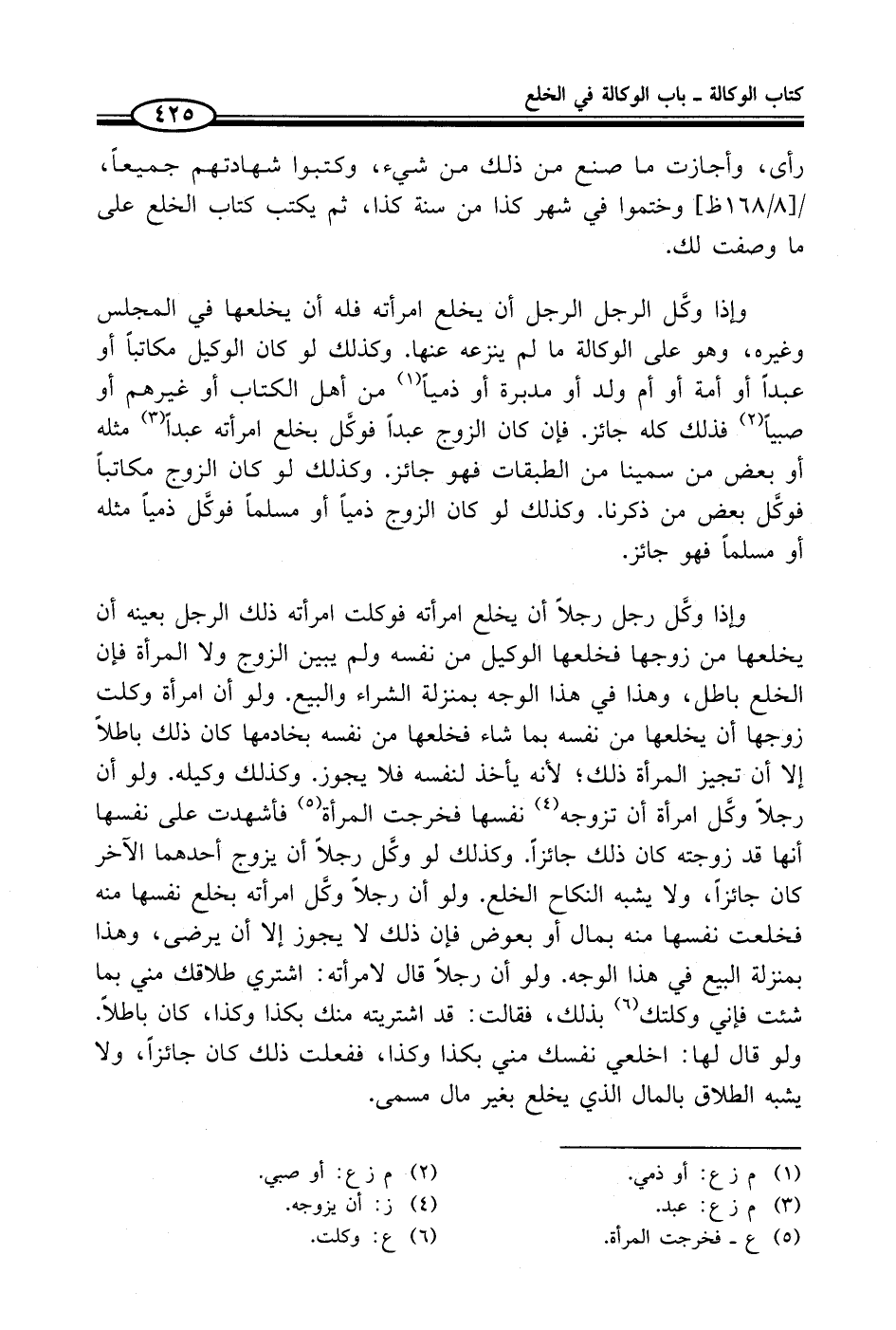 رأى، وأجازت ما صنع من ذلك من شيء، وكتبوا شهادتهم جميعاً، وختموا في شهر كذا من سنة كذا، ثم يكتب كتاب الخلع على ما وصفت لك.