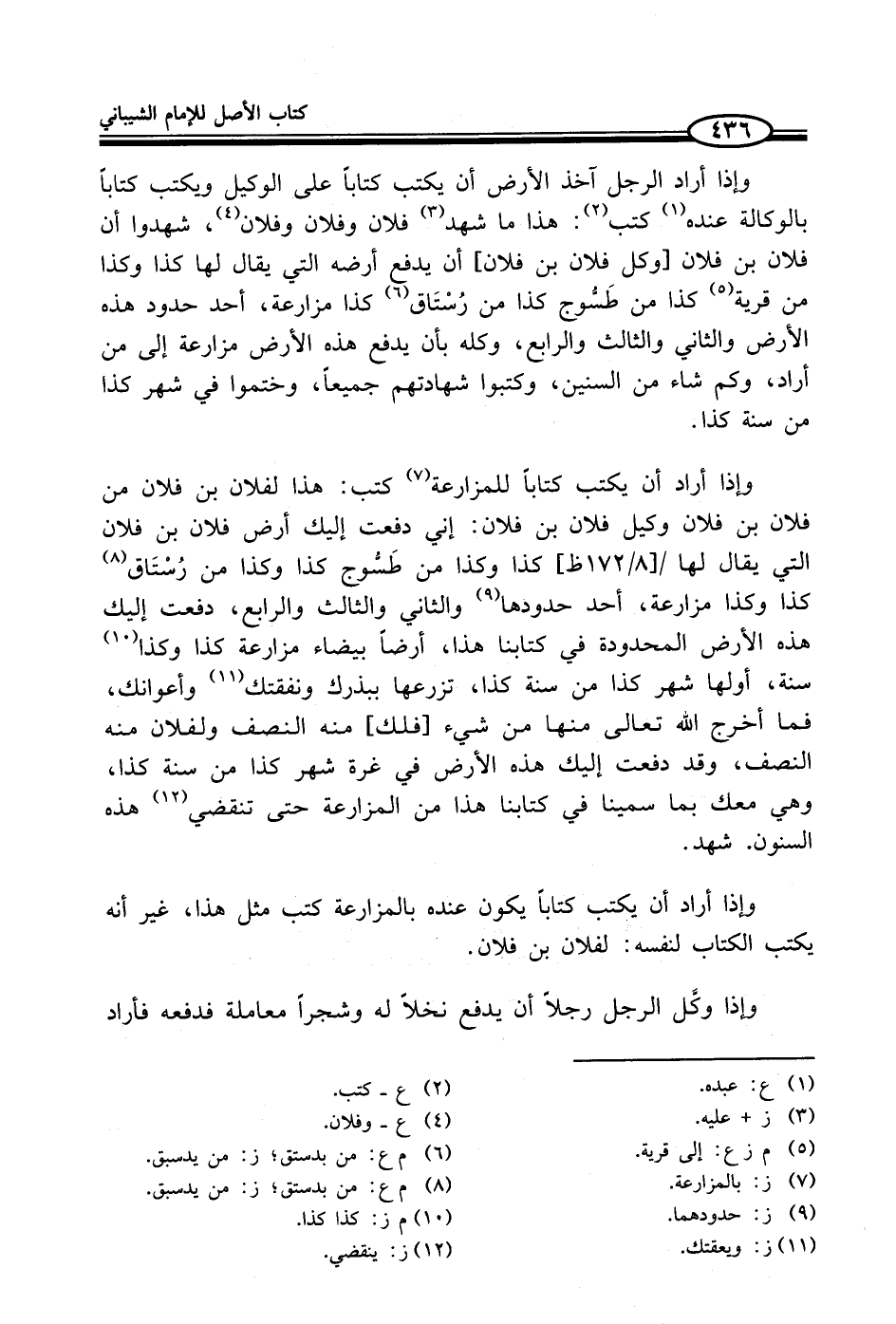 وإذا أراد أن يكتب كتاباً للمزارعة (¬7) كتب: هذا لفلان بن فلان من فلان بن فلان وكيل فلان بن فلان: إني دفعت إليك أرض فلان بن فلان التي يقال لها كذا وكذا من طَسُّوج كذا وكذا من رُسْتَاق (¬8) كذا وكذا مزارعة، أحد حدودها (¬9) والثاني والثالث والرابع، دفعت إليك هذه الأرض المحدودة في كتابنا هذا، أرضاً بيضاء مزارعة كذا وكذا (¬10) سنة، أولها شهر كذا من سنة كذا، تزرعها ببذرك ونفقتك (¬11) وأعوانك، فما أخرج الله تعالى منها من شيء [فلك] منه النصف ولفلان منه النصف، وقد دفعت إليك هذه الأرض في غرة شهر كذا من سنة كذا، وهي معك بما سمينا في كتابنا هذا من المزارعة حتى تنقضي (¬12) هذه السنون. شهد.