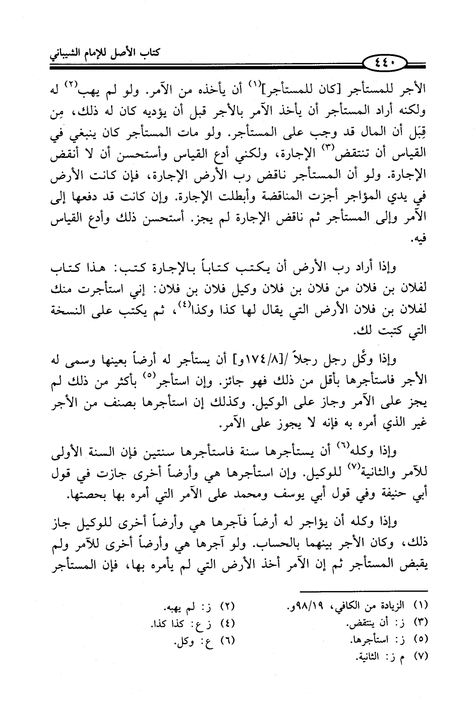 وإذا أراد رب الأرض أن يكتب كتاباً بالإجارة كتب: هذا كتاب لفلان بن فلان من فلان بن فلان وكيل فلان بن فلان: إني استأجرت منك لفلان بن فلان الأرض التي يقال لها كذا وكذا (¬4)، ثم يكتب على النسخة التي كتبت لك.