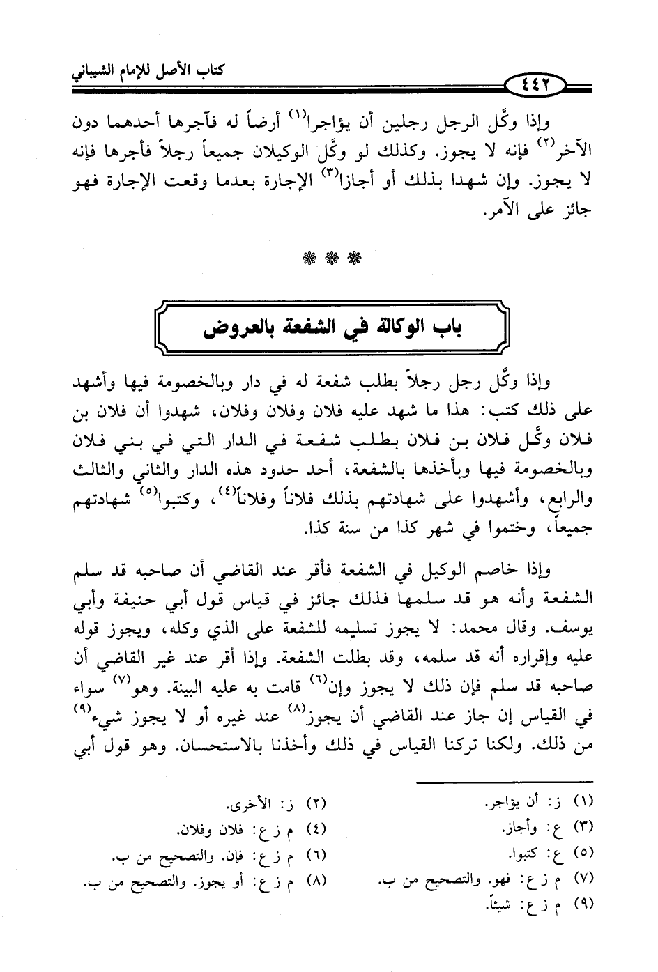 وإذا وكَّل رجل رجلاً طلب شفعة له في دار وبالخصومة فيها وأشهد على ذلك كتب: هذا ما شهد عليه فلان وفلان وفلان، شهدوا أن فلان بن فلان وكَّل فلان بن فلان بطلب شفعة في الدار التي في بني فلان وبالخصومة فيها وبأخذها بالشفعة، أحد حدود هذه الدار والثاني والثالث والرابعٍ، وأشهدوا على شهادتهم بذلك فلاناً وفلاناً (¬4)، وكتبوا (¬5) شهادتهم جميعاً، وختموا في شهر كذا من سنة كذا.