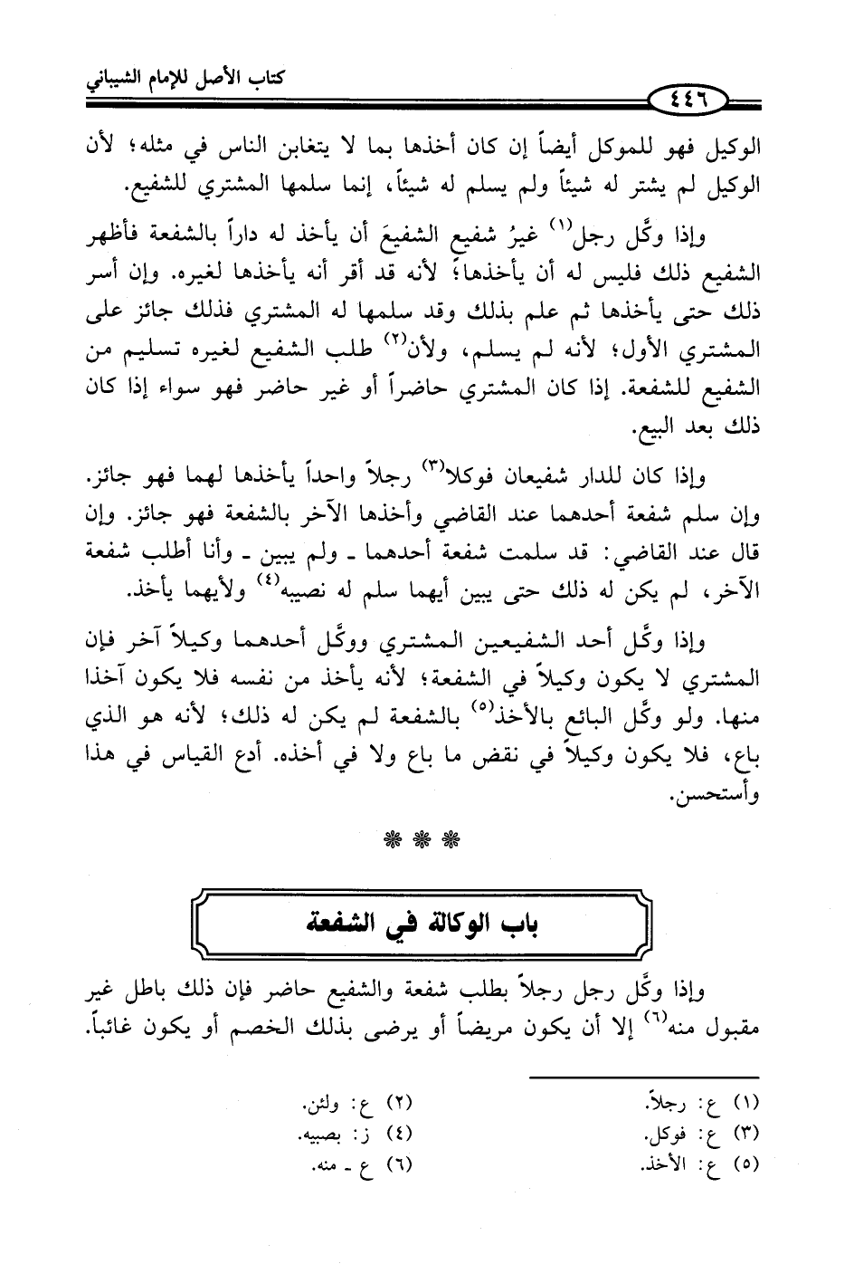 وإذا وكَّل أحد الشفيعين المشتري ووكَّل أحدهما وكيلاً آخر فإن المشتري لا يكون وكيلاً في الشفعة؛ لأنه يأخذ من نفسه فلا يكون آخذا منها. ولو وكَّل البائع بالأخذ (¬5) بالشفعة لم يكن له ذلك؛ لأنه هو الذي باع، فلا يكون وكيلاً في نقض ما باع ولا في أخذه. أدع القياس في هذا وأستحسن.