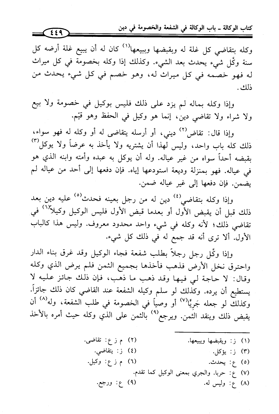 وإذا وكَّل رجل رجلاً بطلب شفعة فجاء الوكيل وقد غرق بناء الدار واحترق نخل الأرض فذهب فأخذها بجميع الثمن فلم يرض الذي وكله وقال: لا حاجة لي فيها وقد ذهب ما ذهب، فإن ذلك جائز عليه لا يستطيع أن يرده. وكذلك لو سلم وكيله الشفعة عند القاضي كان ذلك جائزاً. وكذلك لو جعله جَرِيًّا (¬7) أو وصياً في الخصومة في طلب الشفعة، وله (¬8) أن يقبض ذلك وينقد الثمن. ويرجع (¬9) بالثمن على الذي وكله حيث أمره بالأخذ