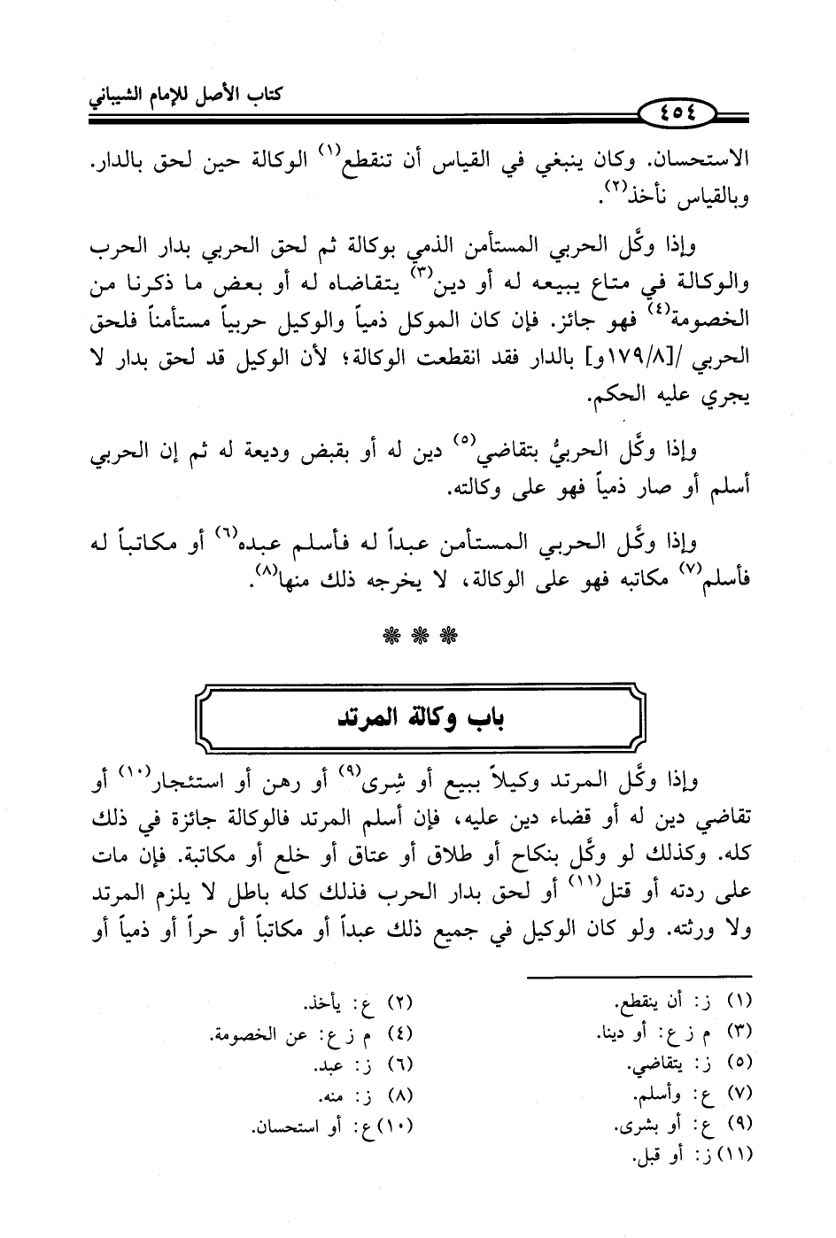 وإذا وكَّل الحربي المستأمن الذمي بوكالة ثم لحق الحربي بدار الحرب والوكالة في متاع يبيعه له أو دين (¬3) يتقاضاه له أو بعض ما ذكرنا من الخصومة (¬4) فهو جائز. فإن كان الموكل ذمياً والوكيل حربياً مستأمناً فلحق الحربي بالدار فقد انقطعت الوكالة؛ لأن الوكيل قد لحق بدار لا يجري عليه الحكم.