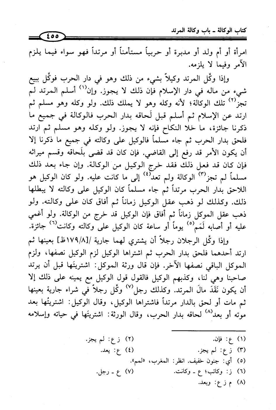 وإذا وكَّل المرتد وكيلاً بشيء من ذلك وهو في دار الحرب فوكَّل ببيع شيء من ماله في دار الإسلام فإن ذلك لا يجوز. وإن (¬1) أسلم المرتد لم تجز (¬2) تلك الوكالة؛ لأنه وكله وهو لا يملك ذلك. ولو وكله وهو مسلم ثم ارتد عن الإسلام ثم أسلم قبل لَحاقه بدار الحرب فالوكالة في جميع ما ذكرنا جائزة، ما خلا النكاح فإنه لا يجوز. ولو وكله وهو مسلم ثم ارتد فلحق بدار الحرب ثم جاء مسلماً فالوكيل على وكالته في جميع ما ذكرنا إلا أن يكون الأمر قد رفع إلى القاضي. فإن كان قد قضى بلَحاقه وقسم ميراثه فإن كان قد فعل ذلك فقد خرج الوكيل من الوكالة. وإن جاء بعد ذلك مسلماً لم تجز (¬3) الوكالة ولم تعد (¬4) إلى ما كانت عليه. ولو كان الوكيل هو اللاحق بدار الحرب مرتداً ثم جاء مسلماً كان الوكيل على وكالته لا يبطلها ذلك. وكذلك لو ذهب عقل الوكيل زماناً ثم أفاق كان على وكالته. ولو ذهب عقل الموكل زماناً ثم أفاق فإن الوكيل قد خرج من الوكالة. ولو أغمي عليه أو أصابه لَمَم (¬5) يوماً أو ساعة كان الوكيل على وكالته وكانت (¬6) جائزة. وإذا وكَّل الرجلان رجلاً أن يشتري لهما جارية بعينها ثم ارتد أحدهما فلحق بدار الحرب ثم اشتراها الوكيل لزم الوكيل نصفها، ولزم الموكل الباقي نصفها الآخر. فإن قال ورثة الموكل: اشتريتَها قبل أن يرتد صاحبنا وهي لنا، وكذبهم الوكيل فالقول قول الوكيل مع يمينه على ذلك إلا أن يكون نَقَدَ مالَ المرتد. وكذلك رجل (¬7) وكَّل رجلاً في شراء جارية بعينها ثم مات أو لحق بالدار مرتداً فاشتراها الوكيل، وقال الوكيل: اشتريتُها بعد موته أو بعد (¬8) لحاقه بدار الحرب، وقال الورثة: اشتريتَها في حياته وإسلامه