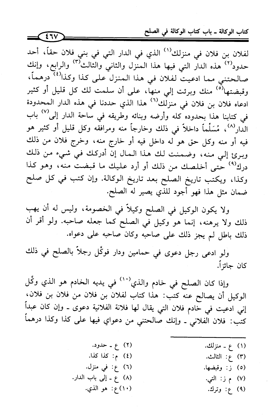 وإذا كان الصلح في خادم والذي (¬10) في يديه الخادم هو الذي وكَّل الوكيل أن يصالح عنه كتب: هذا كتاب لفلان بن فلان من فلان بن فلان، إني ادعيت في خادم فلان التي يقال لها فلانة الفلانية دعوى- وإن كان عبداً كتب: فلان الفلاني - وإنك صالحتني من دعواي فيها على كذا وكذا درهماً
