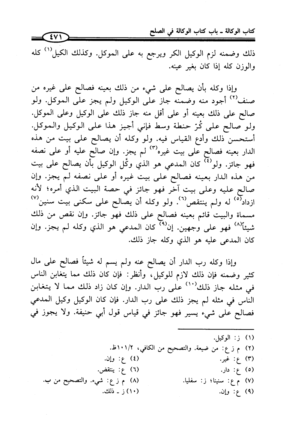 وإذا وكله بأن يصالح على شيء من ذلك بعينه فصالح على غيره من صنف (¬2) أجود منه وضمنه جاز على الوكيل ولم يجز على الموكل. ولو صالح على ذلك بعينه أو على أقل منه جاز ذلك على الوكيل وعلى الموكل. ولو صالح على كُرّ حنطة وسط فإني أجيز هذا على الوكيل والموكل. أستحسن ذلك وأدع القياس فيه. ولو وكله أن يصالح على بيت من هذه الدار بعينه فصالح على بيت غيره (¬3) لم يجز. وإن صالح عليه أو على نصفه فهو جائز. ولو (¬4) كان المدعي هو الذي وكَّل الوكيل بأن يصالح على بيت من هذه الدار بعينه فصالح على بيت غيره أو على نصفه لم يجز. وإن صالح عليه وعلى بيت آخر فهو جائز في حصة البيت الذي أمره؛ لأنه ازداد (¬5) له ولم ينتقص (¬6). ولو وكله أن يصالح على سكنى بيت سنين (¬7) مسماة والبيت قائم بعينه فصالح على ذلك فهو جائز. وإن نقص من ذلك شيئاً (¬8) فهو على وجهين. إن (¬9) كان المدعي هو الذي وكله لم يجز. وإن كان المدعى عليه هو الذي وكله جاز ذلك.
