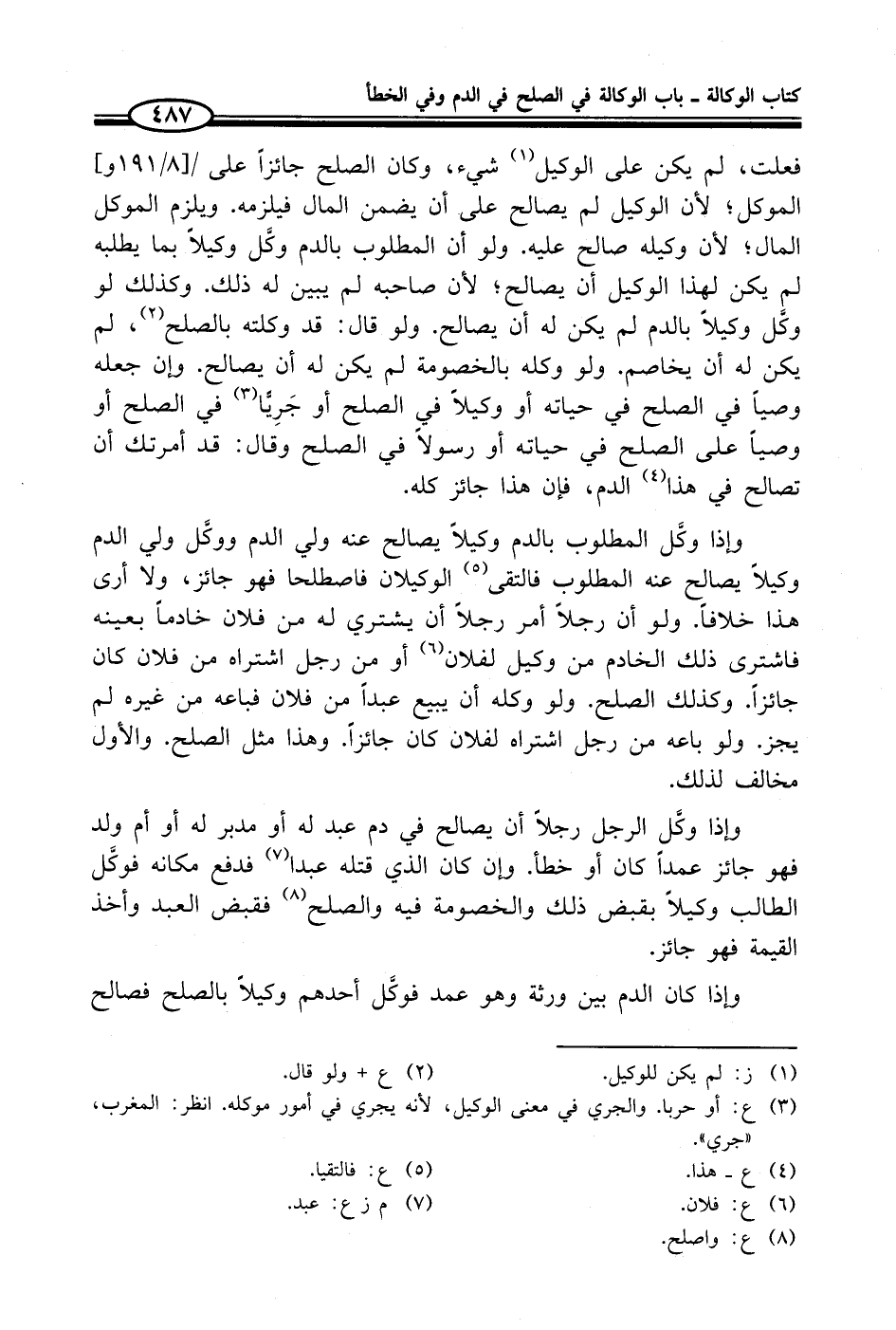 وإذا وكَّل المطلوب بالدم وكيلاً يصالح عنه ولي الدم ووكَّل ولي الدم وكيلاً يصالح عنه المطلوب فالتقى (¬5) الوكيلان فاصطلحا فهو جائز، ولا أرى هذا خلافاً. ولو أن رجلاً أمر رجلاً أن يشتري له من فلان خادماً بعينه فاشترى ذلك الخادم من وكيل لفلان (¬6) أو من رجل اشتراه من فلان كان جائزاً. وكذلك الصلح. ولو وكله أن يبيع عبداً من فلان فباعه من غيره لم يجز. ولو باعه من رجل اشتراه لفلان كان جائزاً. وهذا مثل الصلح. والأول مخالف لذلك.