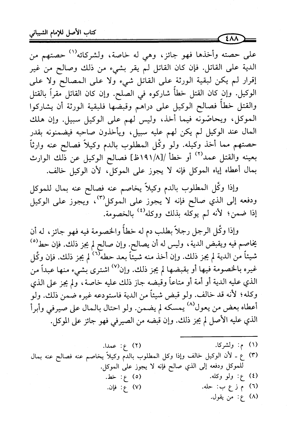 (¬3) ع - لأن الوكيل خالف وإذا وكل المطلوب بالدم وكيلاً يخاصم عنه فصالح عنه بمال للموكل ودفعه إلى الذي صالح فإنه لا يجوز على الموكل.